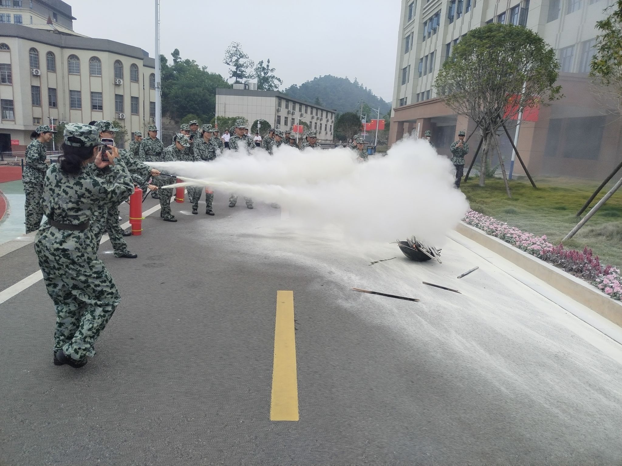 学生使用干粉灭火器扑灭初期火灾