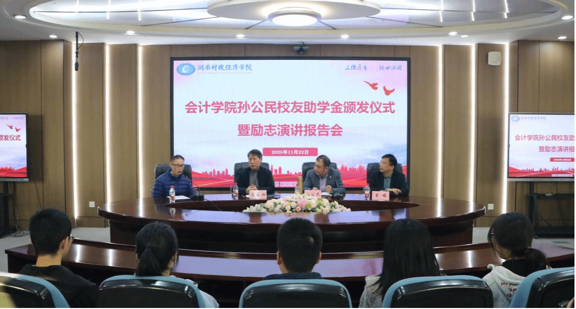 (本网讯)11月22日下午,会计学院于办公楼五楼视频会议室隆重举行孙公民校友助学金颁发仪式暨励志报告会。会计学院党委书记戴恩湘、副书记肖芳、副院长(挂职)曾峻、综合办主任蔡奕帆、学工办主任蔡益华,以及全体受助学生与学生代表近百人齐聚一堂,共同参与了这场温情与励志交织的报告会。