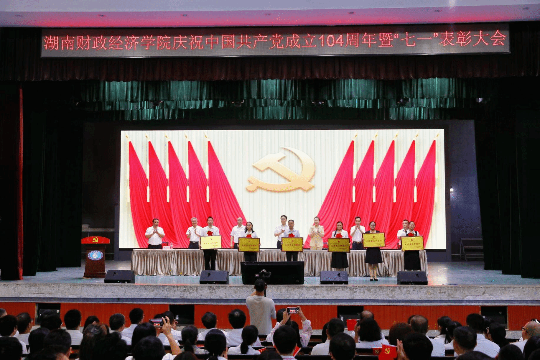 副校长赵鹤平宣读了表彰决定。学校领导为“光荣在党50年”老党员代表颁发纪念章;为永利获评湖南省高校党建工作“标杆院系”“样板支部”“党务工作示范岗”“青年教工党员示范岗”的先进集体和个人,以及学校41名优秀共产党员、8名优秀党务工作者、6个先进基层党组织代表颁发奖牌和荣誉证书。