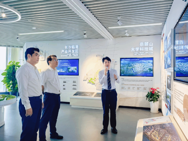座谈前,易棉阳一行参观了湘江集团企业展厅。湘江运营公司、大科城公司、湘江商管公司和学校教务处、资产管理处、后勤处、计算机与人工智能学院、创新创业与人工智能学院等单位负责人参与座谈或陪同调研。