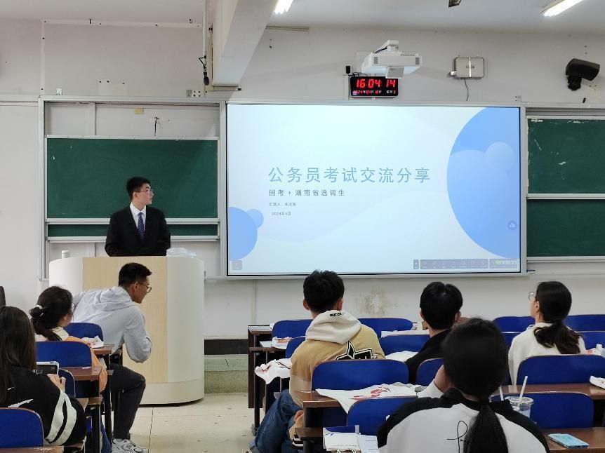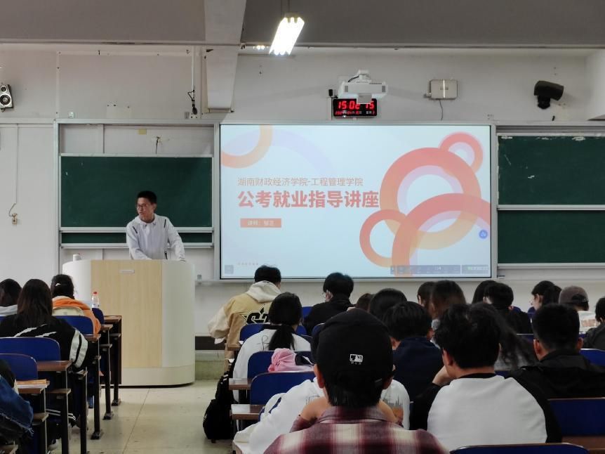 邹老师从工程管理学院所涵盖专业的公考岗位现状出发,针对选调生、国考和湖南省考三大公务员考试机会进行了详尽讲解。邹老师的分享不仅让同学们对公考有了全面的了解,还让大家在轻松的互动中掌握了岗位选择的要领。