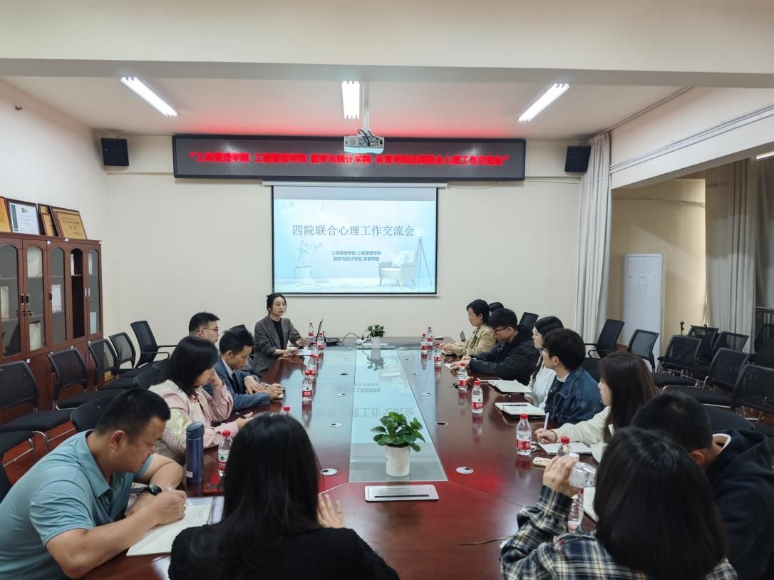 (本网讯)为进一步提高各学院心理健康工作能力与管理水平,全面加强和改进心理健康工作,提升辅导员心理育人工作实效,4月11日上午,工程管理学院与工商管理学院、数学与统计学院、体育学院在办公楼414开展心理工作交流会。本次会议由永利心理健康中心周彩萍老师主持,工商管理学院党委书记郭丽、我院党委副书记刘绿丝、以及全体专兼职辅导员参加本次会议。