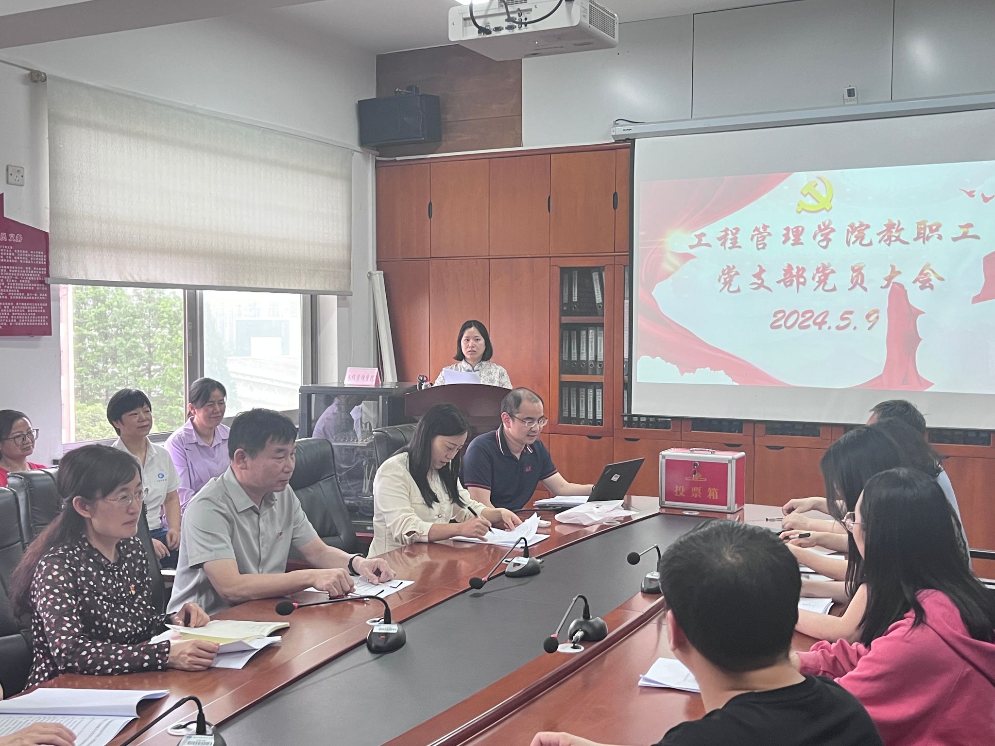 (本网讯)5月9日下午,工程管理学院教职工党支部在办公楼911召开全体党员大会,选举新一届支部委员会、支部书记和副书记,全体教职工党员参会。