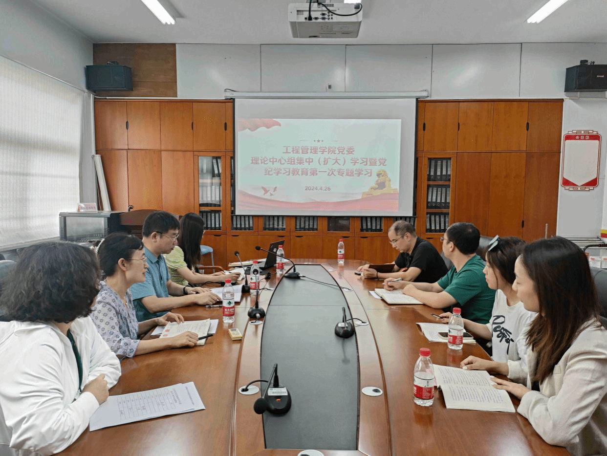 4月26日,工程管理学院党委在办公楼911召开理论中心组集中(扩大)学习暨党纪学习教育第一次专题学习研讨会,院党委副书记刘绿丝主持会议,全体院领导、院党委委员、各党支部书记及学院科级干部参加。