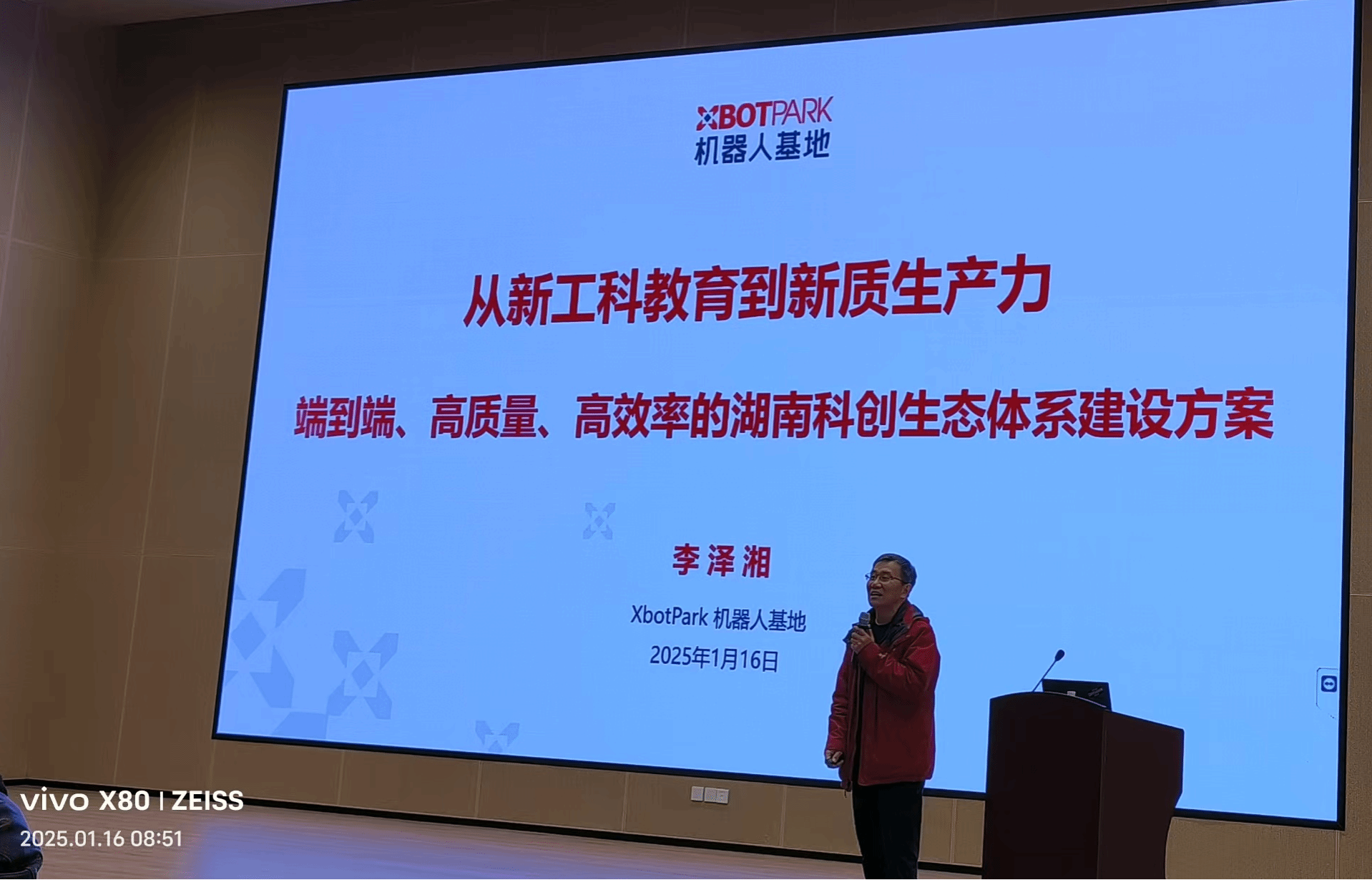 随后,李泽湘教授在会上作了题为《从新工科教育到新质生产力 端到端、高质量、高效率的湖南科创生态体系建设方案》的主题报告。他深入剖析了新工科教育与科技创新生态体系建设的紧密联系,为与会者提供了宝贵的思路和建议,受到了广泛赞誉。