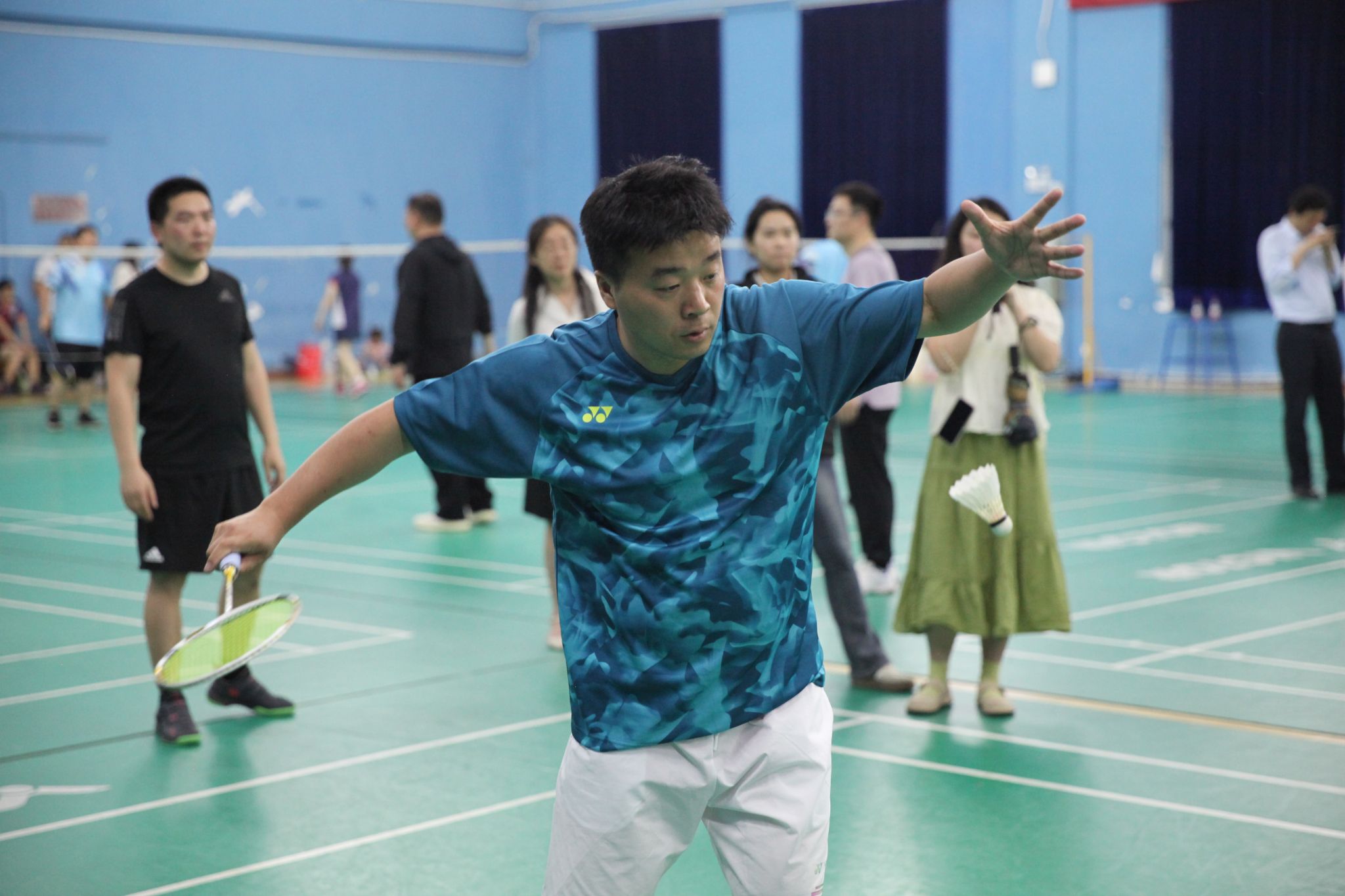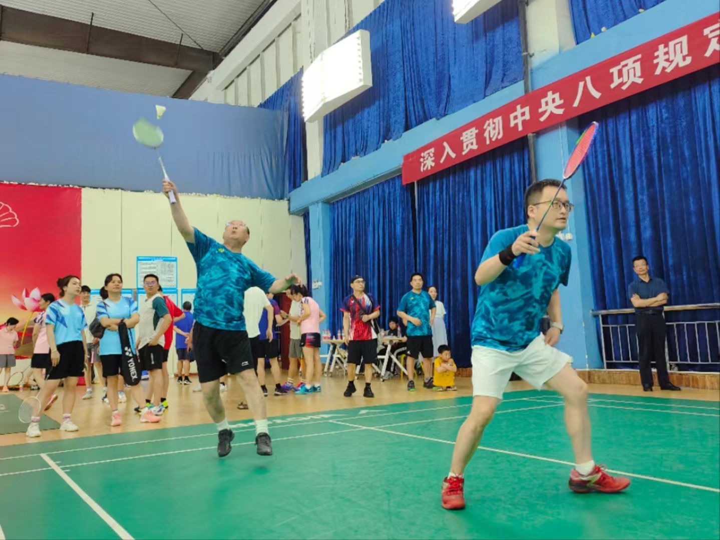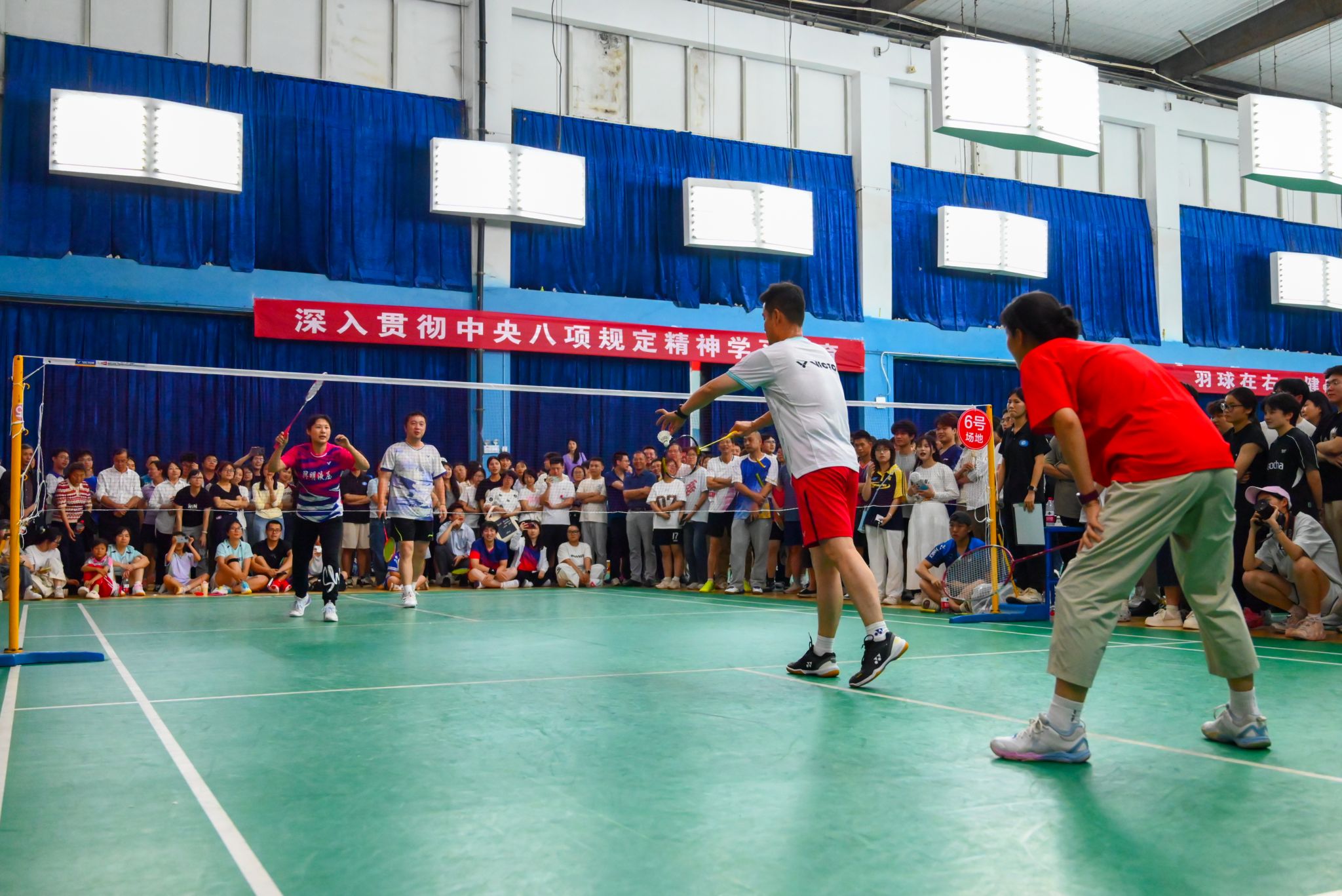 本次比赛创新设置廉洁知识竞答环节,以寓教于赛的形式弘扬崇廉尚洁之风。赛事采用混合团体赛制,设有男单、女单、男双、女双、混双五个项目,通过淘汰赛与决赛层层递进,赛程紧凑、对决激烈。赛场上,参赛队员们配合默契,时而腾空跃起、强力扣杀,时而轻盈吊球、巧妙搓网,充分展现了团结协作、奋勇拼搏的体育精神;赛场下,加油声、呐喊声此起彼伏,凝聚成鼓舞士气的强大力量。