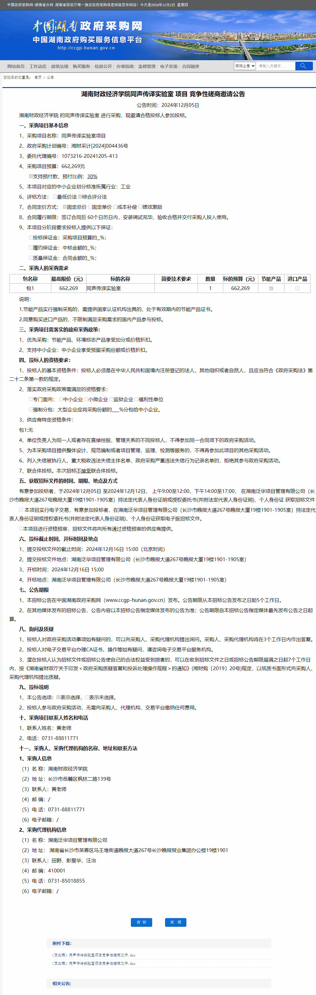 湖南省政府采购网:304永利集团登录入口同声传译实验室项目竞争性磋商邀请公告