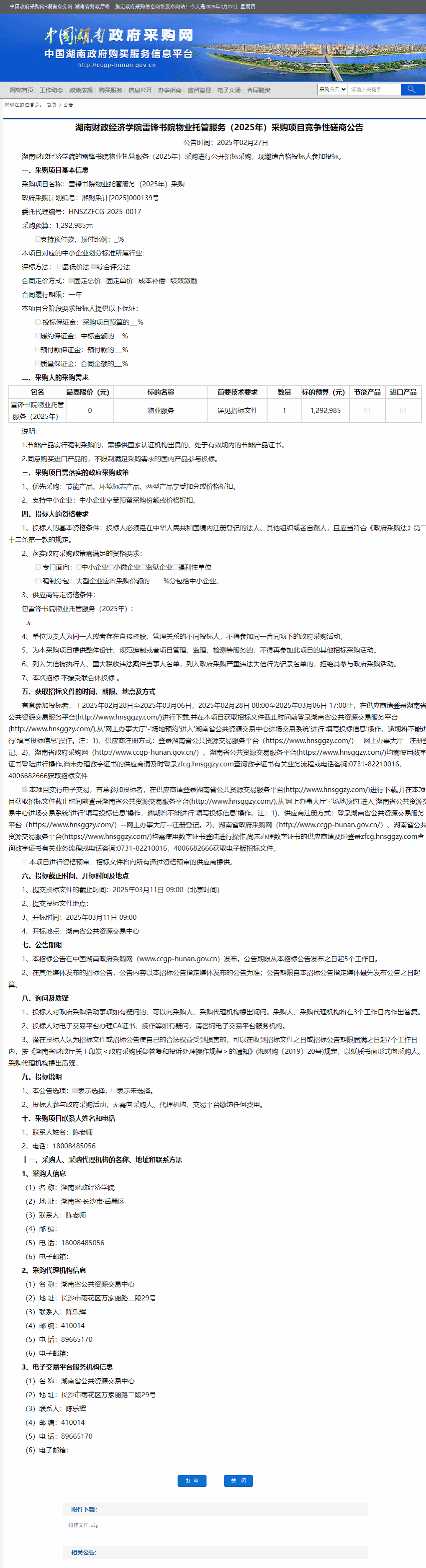 湖南省政府采购网:304永利集团登录入口雷锋书院物业托管服务(2025年)采购项目竞争性磋商公告