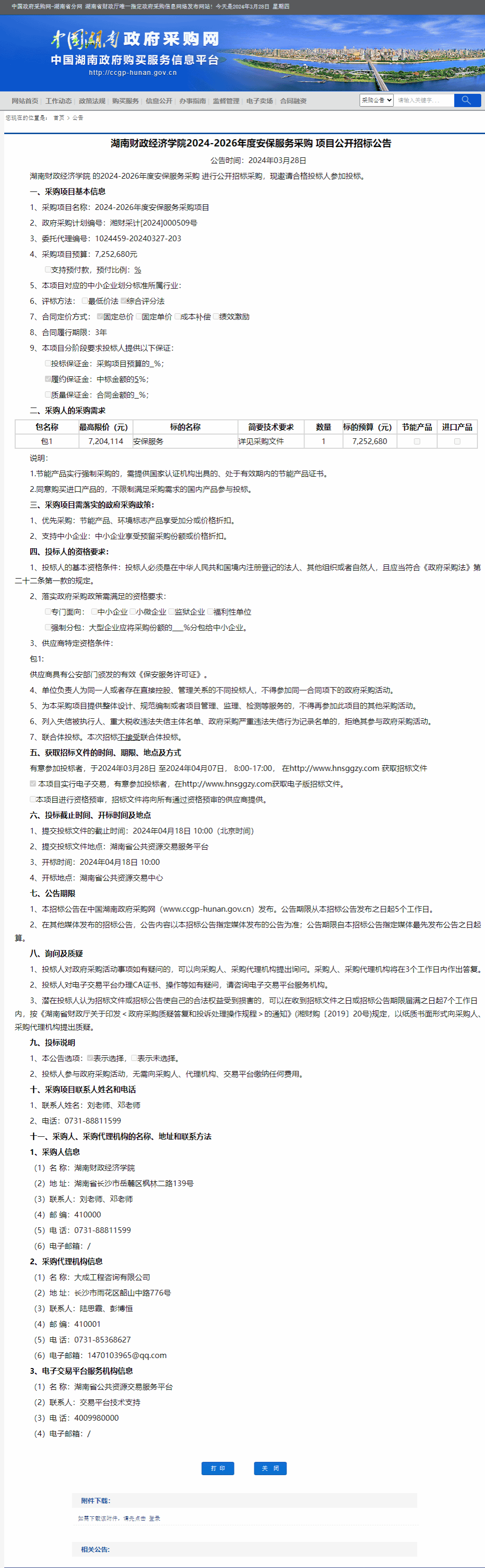 湖南省政府采购网:304永利集团登录入口2024-2026年度安保服务采购项目公开招标公告