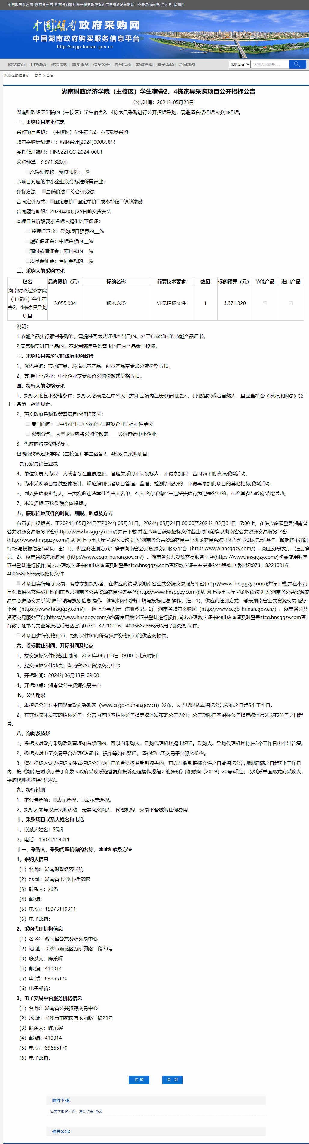 湖南省政府采购网:304永利集团登录入口(主校区)学生宿舍2、4栋家具采购项目公开招标公告