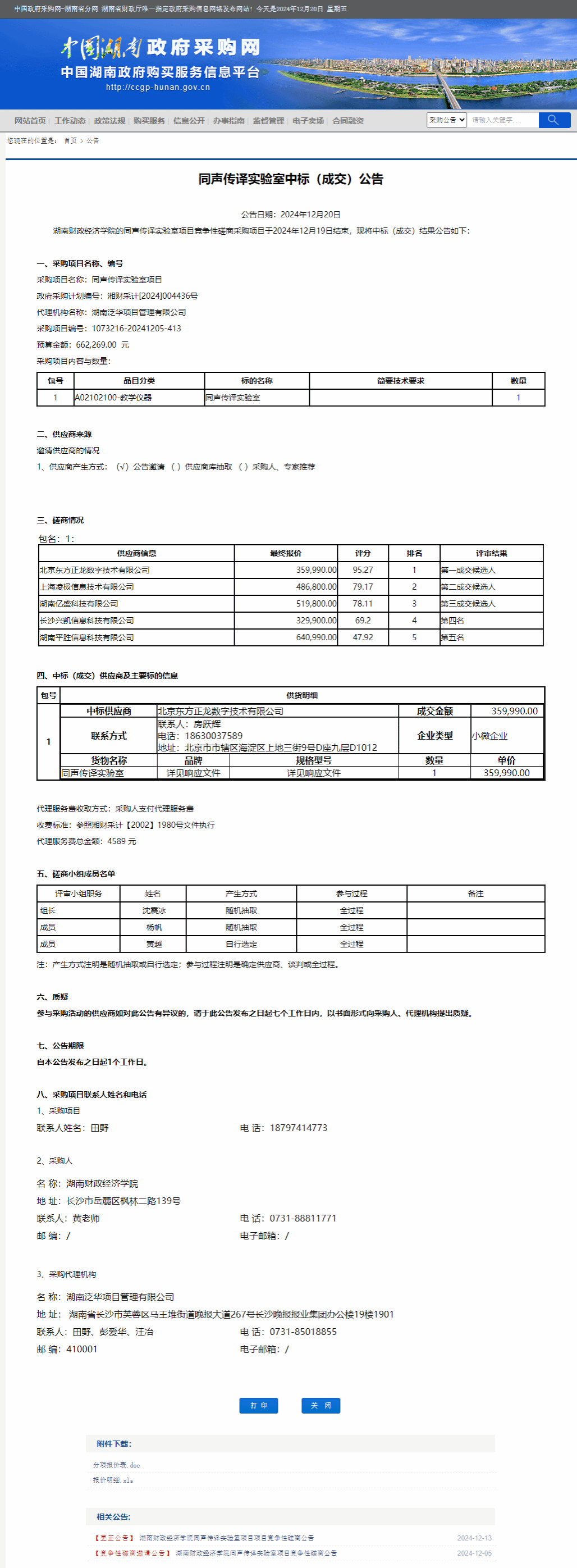 湖南省政府采购网:304永利集团登录入口同声传译实验室中标(成交)公告