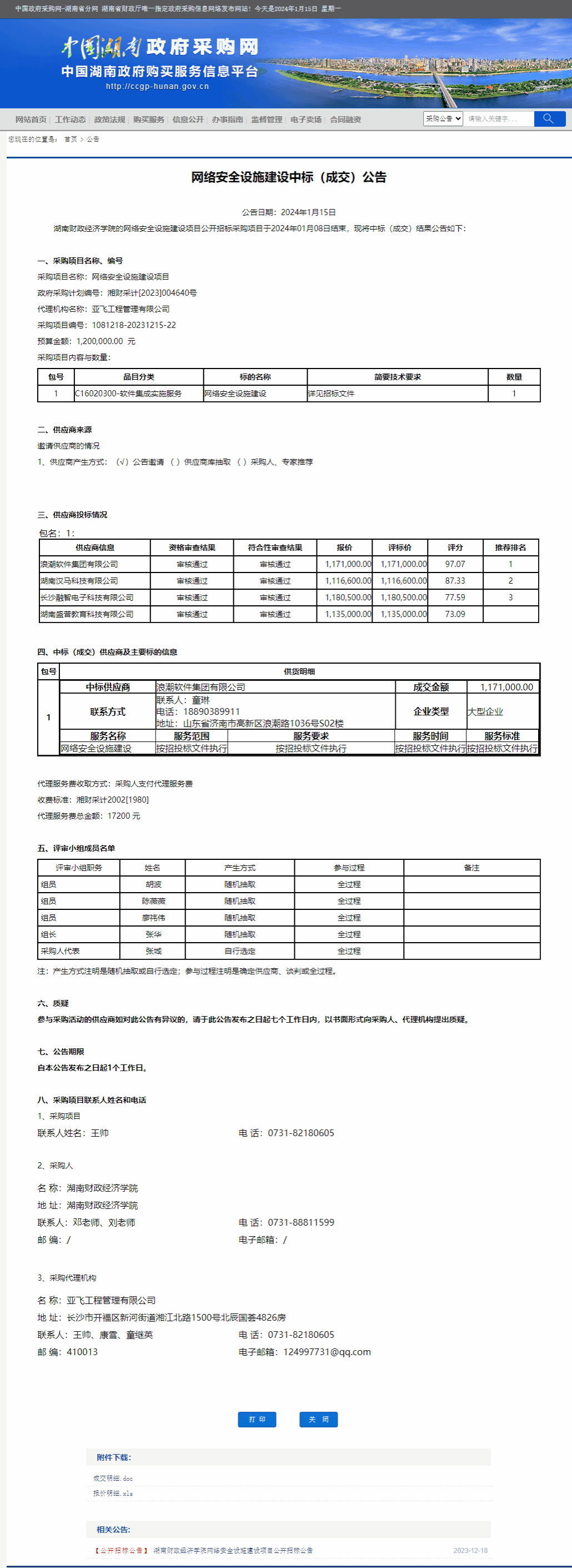 湖南省政府采购网:304永利集团登录入口网络安全设施建设中标(成交)公告