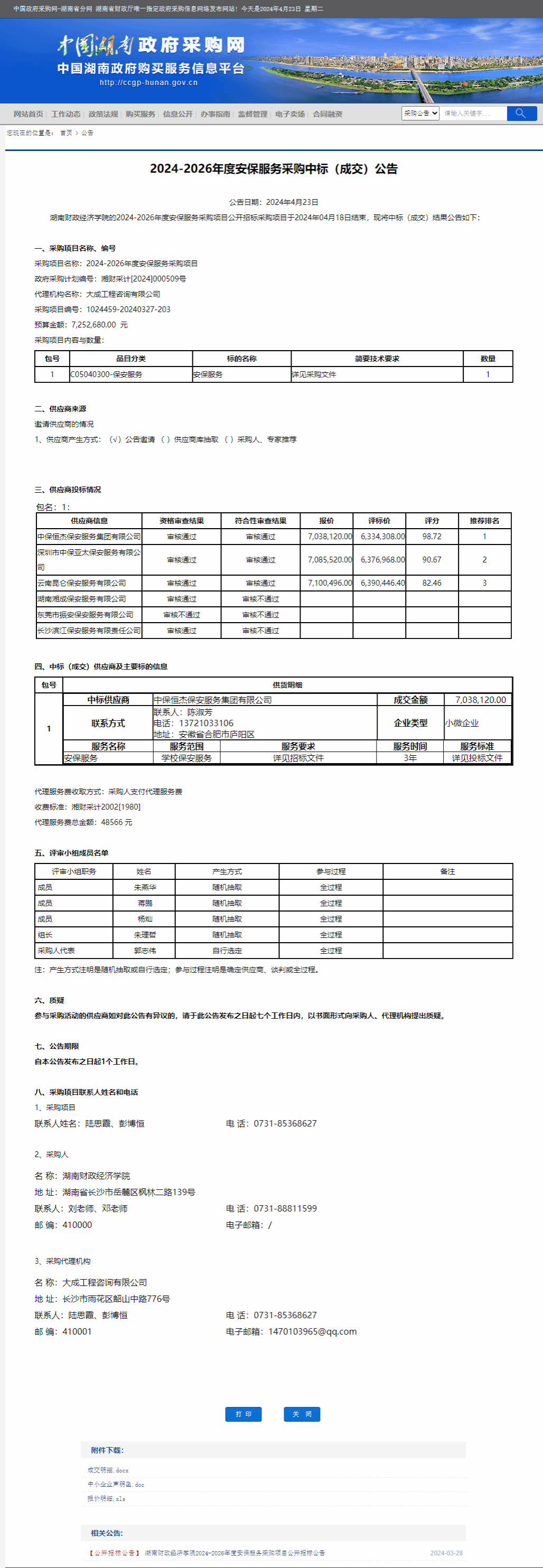 湖南省政府采购网:304永利集团登录入口2024-2026年度安保服务采购中标(成交)公告