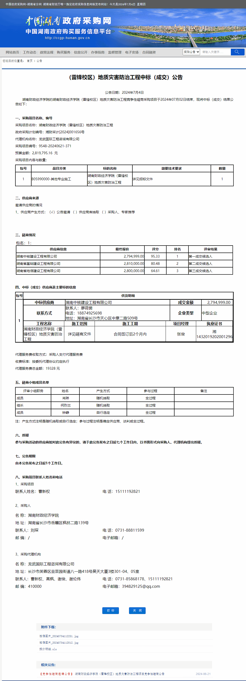 湖南省政府采购网:(雷锋校区)地质灾害防治工程中标(成交)公告