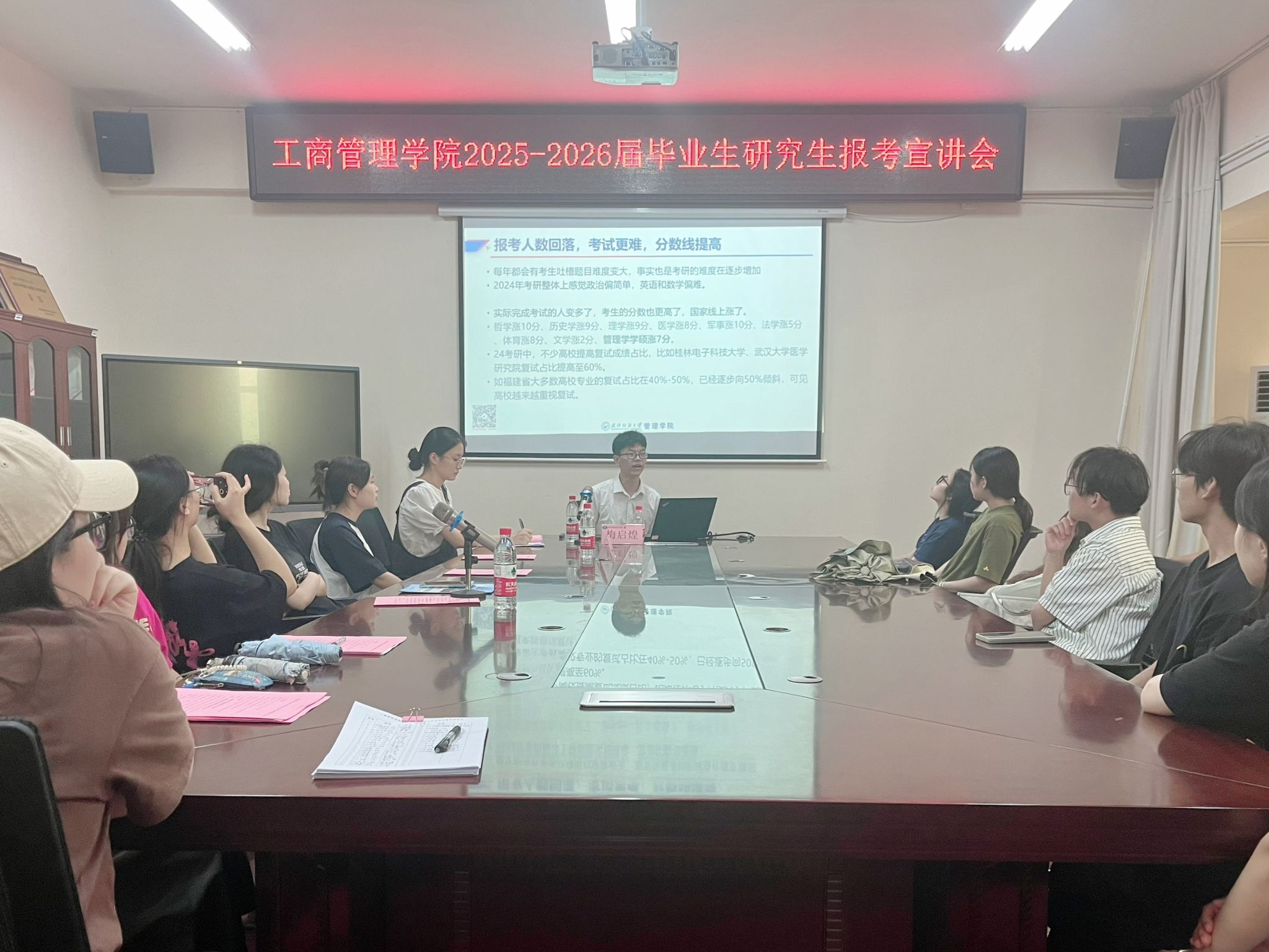 在宣讲中,梅启煌凭借其深厚的学术底蕴,从考研热度的持续飙升、历年报考人数的激增以及考试难度的不断提升等多个角度,深入剖析了当前的考研形势。紧接着,梅启煌针对管理类学生考研,详细地介绍了武汉纺织大学管理学院在培养特色、师资力量、学院信息、创新培养模式以及卓越的就业质量等方面的显著优势,让同学们对该校有了更加全面且深入的认识。在互动环节,同学们纷纷踊跃提问,梅老师则耐心地解答,现场气氛热烈而融洽。