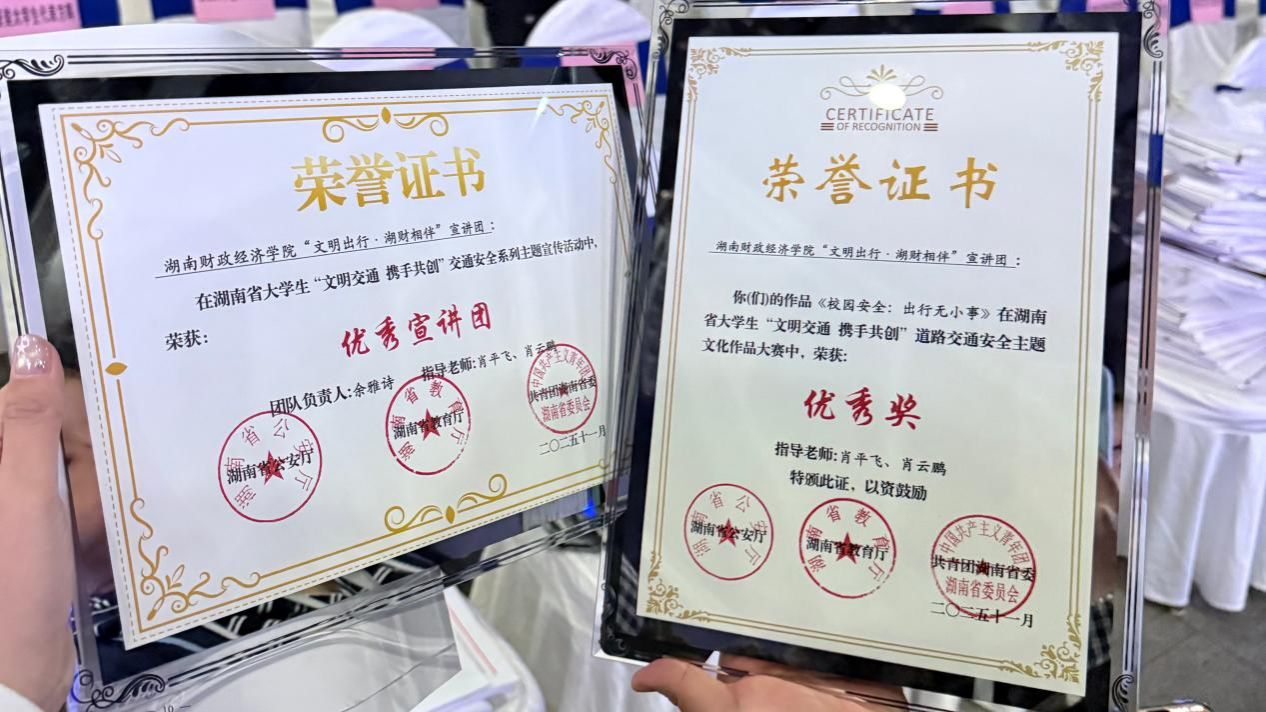近日,在湖南省公安厅、省教育厅、团省委联合主办的“文明交通 携手共创”湖南省大学生道路交通安全主题系列活动中,304永利集团登录入口厚生国际教育学院“文明出行·湖财相伴”宣讲团凭借扎实的实践成果与优质的作品创作,荣获两项省级荣誉——团队获评“优秀宣讲团”,其报送的短视频作品《校园安全:出行无小事》获评“主题文化作品大赛优秀奖”。