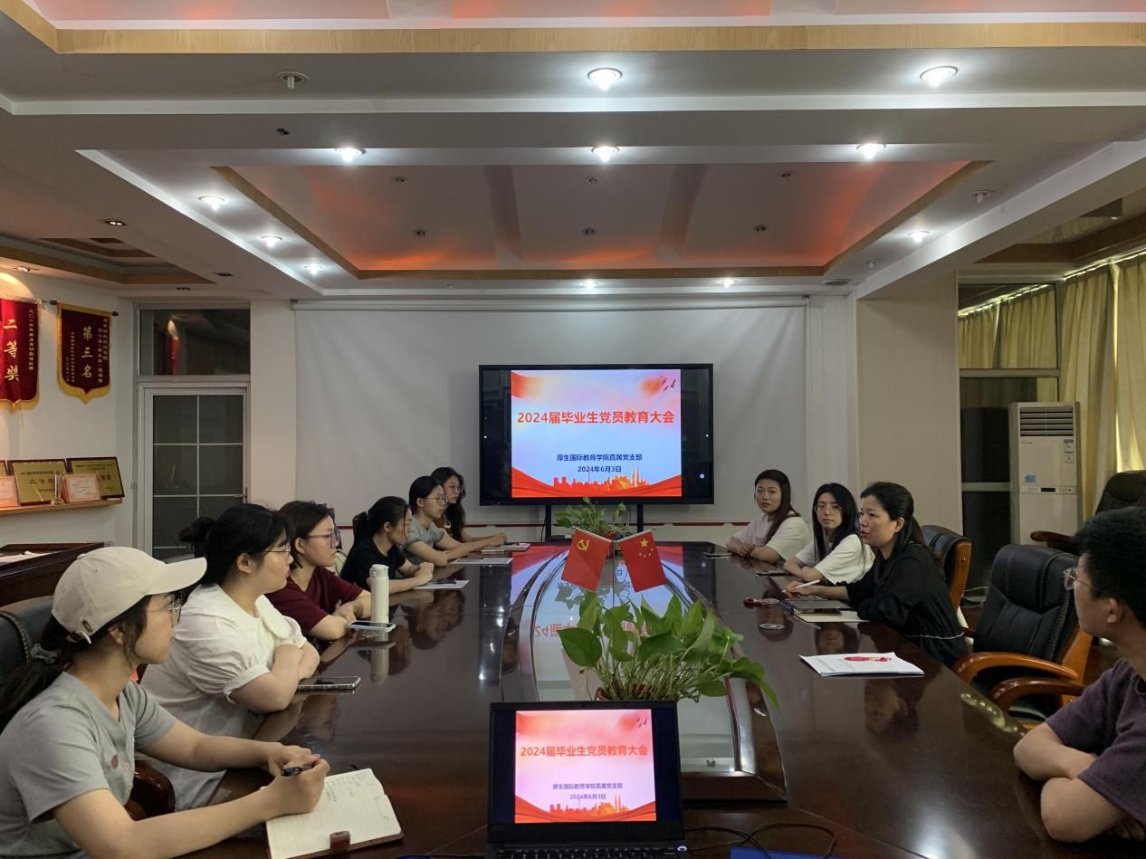 为进一步做好2024届毕业生党员教育管理工作,提高毕业生党员的思想觉悟、党员意识、党性修养和社会责任感,切实发挥党员的模范带头作用,厚生国际教育学院于6月3日在办公楼830会议室召开了毕业生党员教育大会。学院直属党支部书记肖平飞、 直属支部组织委员马艳以及毕业生党员出席本次教育大会。