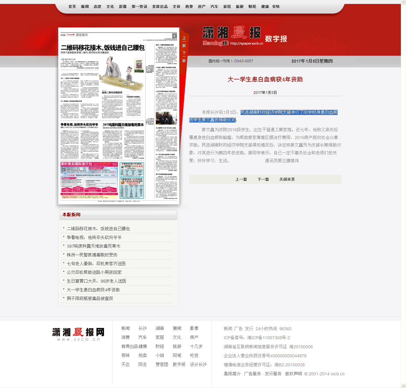 1月5日,潇湘晨报以《大一学生患白血病获4年资助》报道了永利民进304永利集团登录入口支部将学校身患白血病的学生廖文鑫进行为期四年的资助。 报道链接:http://epaper.xxcb.cn/xxcba/html/2017-01/05/con...