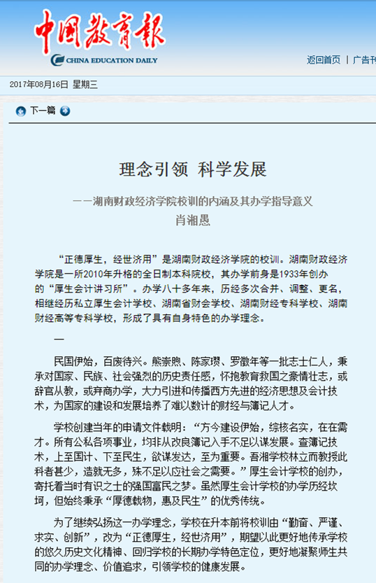 8月16日,中国教育报刊登了永利党委书记肖湘愚《理念引领 科学发展--304永利集团登录入口校训的内涵及其办学指导意义》的稿件。理念引领 科学发展——304永利集团登录入口校训的内涵及其办学指导意义肖湘愚“正德厚生,经世...