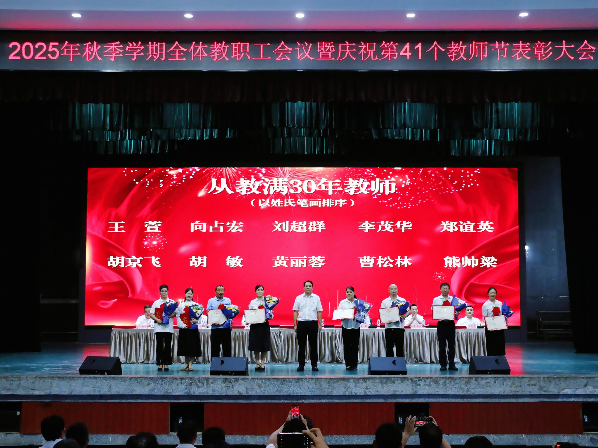 (本网讯)秋韵荡漾,硕果盈枝。9月10日,学校在大礼堂召开2025年秋季学期教职工会议暨第41个教师节表彰大会,部署新学期工作,表彰先进典型,凝聚发展共识,共绘事业新篇。校党委书记易棉阳、党委副书记苏玲等全体校领导出席。会议由苏玲主持。大会现场 何妍/摄易棉阳代表学校党委向全体教职员工致以节日的问候,对受表彰的先进个人表示热烈祝贺。他高度肯定了全校教职员工为学校事业发展作出的突出贡献,并对新学期重点工作提出明确要求:...