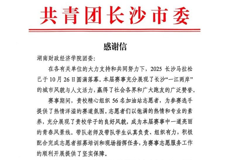 (本网讯)近日,永利团委收到共青团长沙市委员会发来的感谢信,信中对学校在2025长沙马拉松赛事中的志愿服务工作给予高度肯定,并向全体参与服务的师生表示衷心感谢。感谢信指出,在10月26日成功举办的2025长沙马拉松赛事中,永利团委精心组织的56名加油站志愿者,以饱满的热情和专业的服务,为参赛选手营造了热烈有序的赛道氛围,充分展现了永利学子昂扬向上的精神风貌和扎实的志愿服务能力,成为赛事中一道亮丽的青春风景线。同时,...