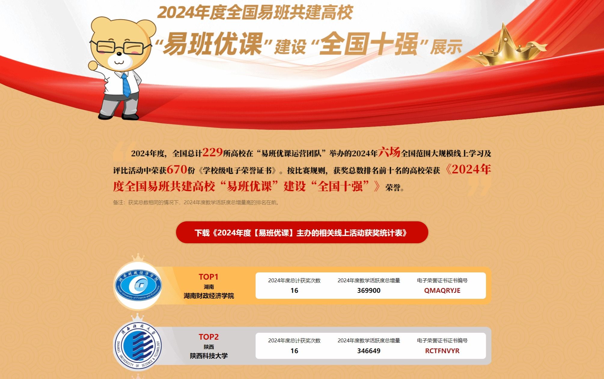 (本网讯)近日,2024年度全国易班共建高校“易班优课”建设评选结果公布,永利荣获2024年度全国易班共建高校“易班优课”建设“全国十强”荣誉。这是永利继2021年以来,第三次获得此项殊荣。2024年,学校借助“易班优课”平台开设了33个优课课程,获得2024年1-10月全国易班优课月度优秀十佳案例、2024年第一届易班优课求职辅导课程学习大赛优秀组织奖、2024年易班网第四届全国大学生简历设计大赛优秀组织奖、2024年易班优课高校美食文化图文课大赛优秀组织奖、...