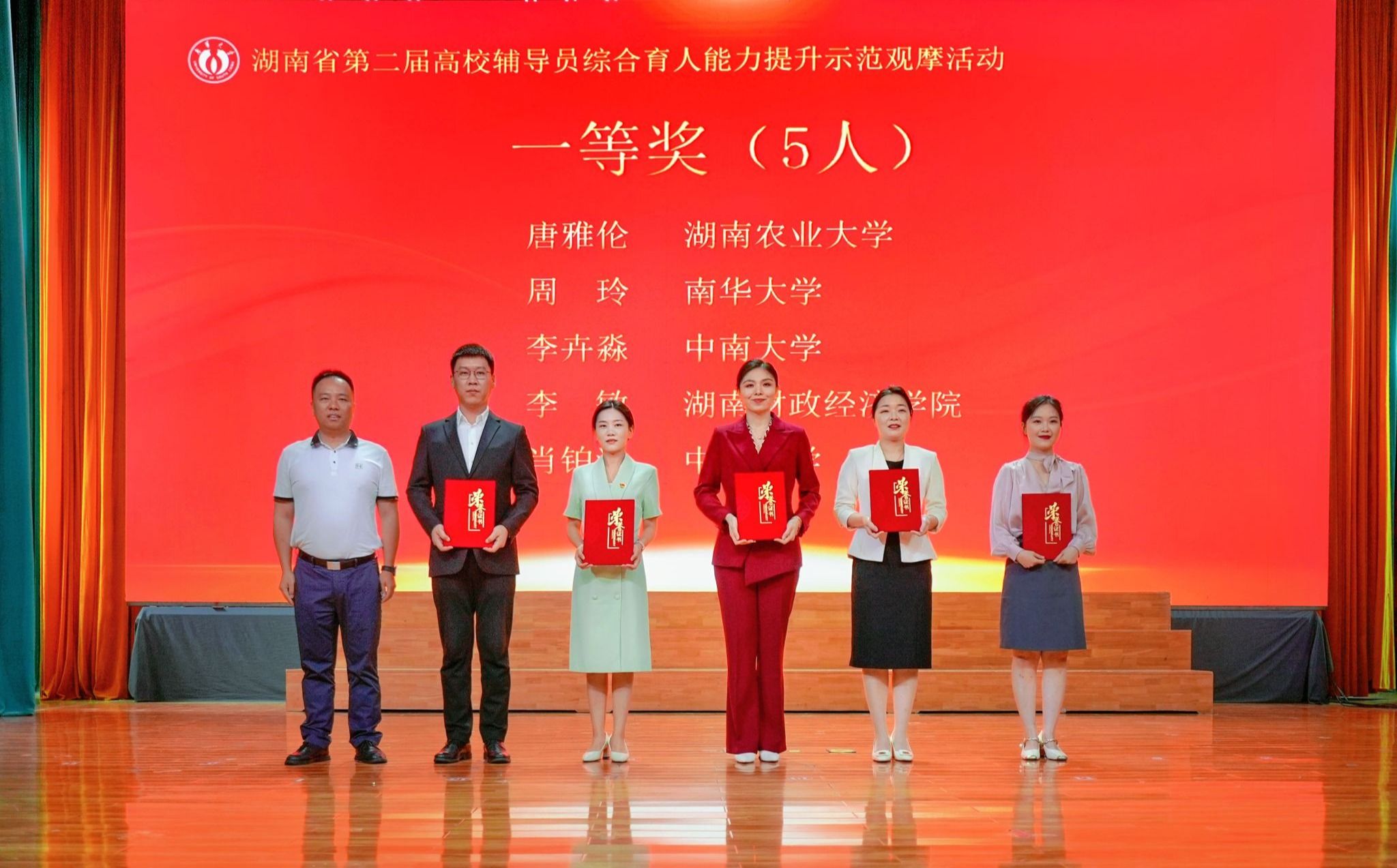 (本网讯)5月23日,湖南省第二届高校辅导员综合育人能力提升示范观摩活动在南华大学圆满落幕。永利会计学院辅导员李敏凭借扎实的专业功底和出色的现场表现,从全省129所高校优秀辅导员中脱颖而出,一举夺得一等奖,实现了永利在该项赛事中的历史性突破。李敏(左三)代表学校上台领奖本次活动由湖南省委教育工委、湖南省教育厅联合主办,南华大学承办,设置理论测试、描述定位、案例研讨、谈心谈话四个竞赛环节,重点考察辅导员的理论功底、...
