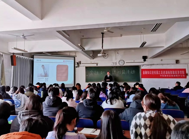 (本网讯)12月23日下午,中信建投证券股份有限公司湖南分公司个人金融部负责人周一飞在学校第三教学楼3210教室作“金融知识进校园”主题讲座。讲座由厚生国际教育学院副院长傅佳主持,120余名学生和部分老师到场聆听...