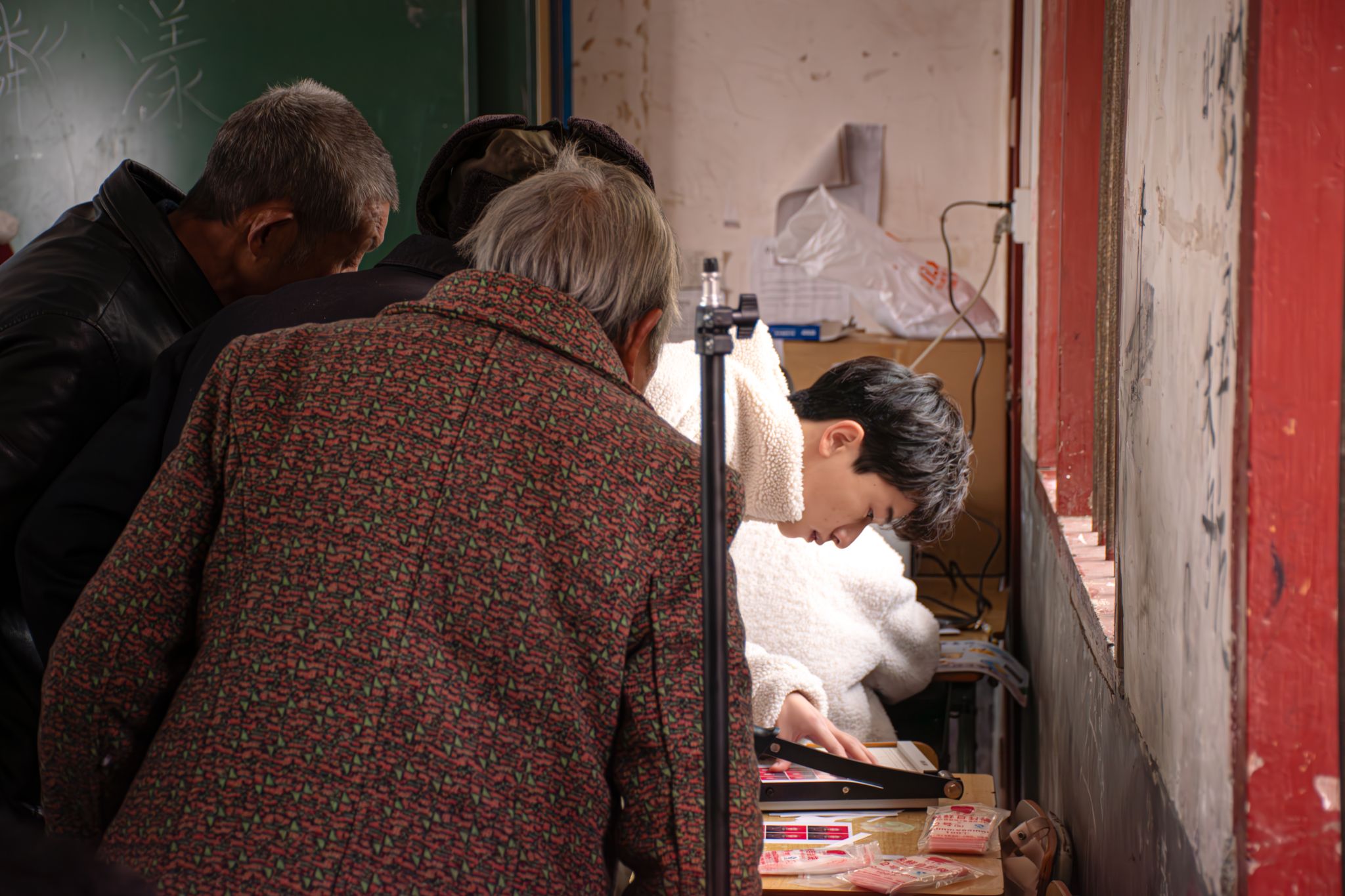 12月10日,在娄底市双峰县杏子铺镇江口村大塘小学的一间教室里,来自学校宣传思想工作队伍的师生志愿者正在为当地村民、村小学生免费拍摄证件照,用镜头记录下他们最美丽的笑容。