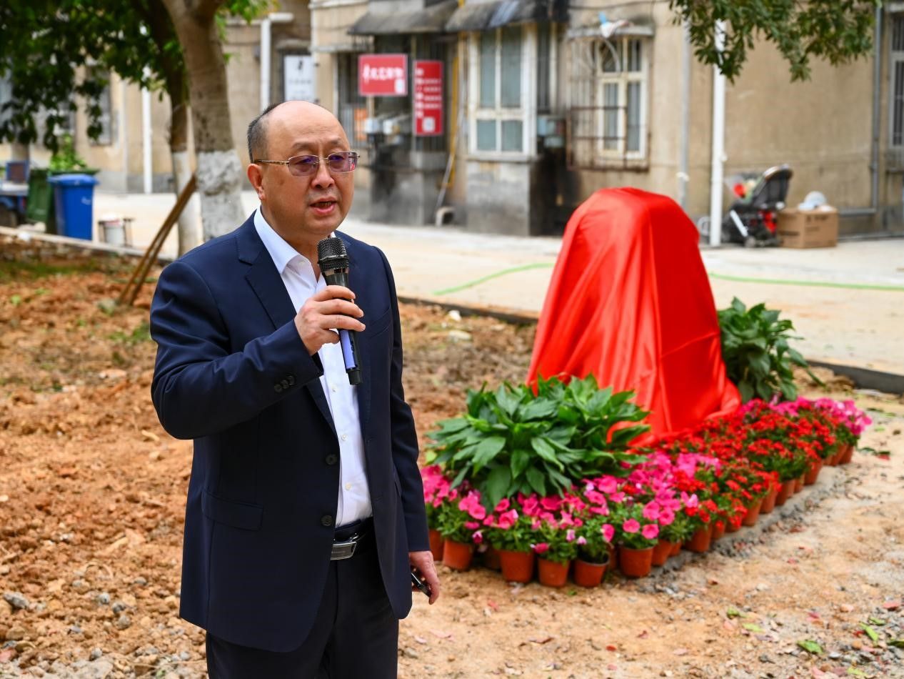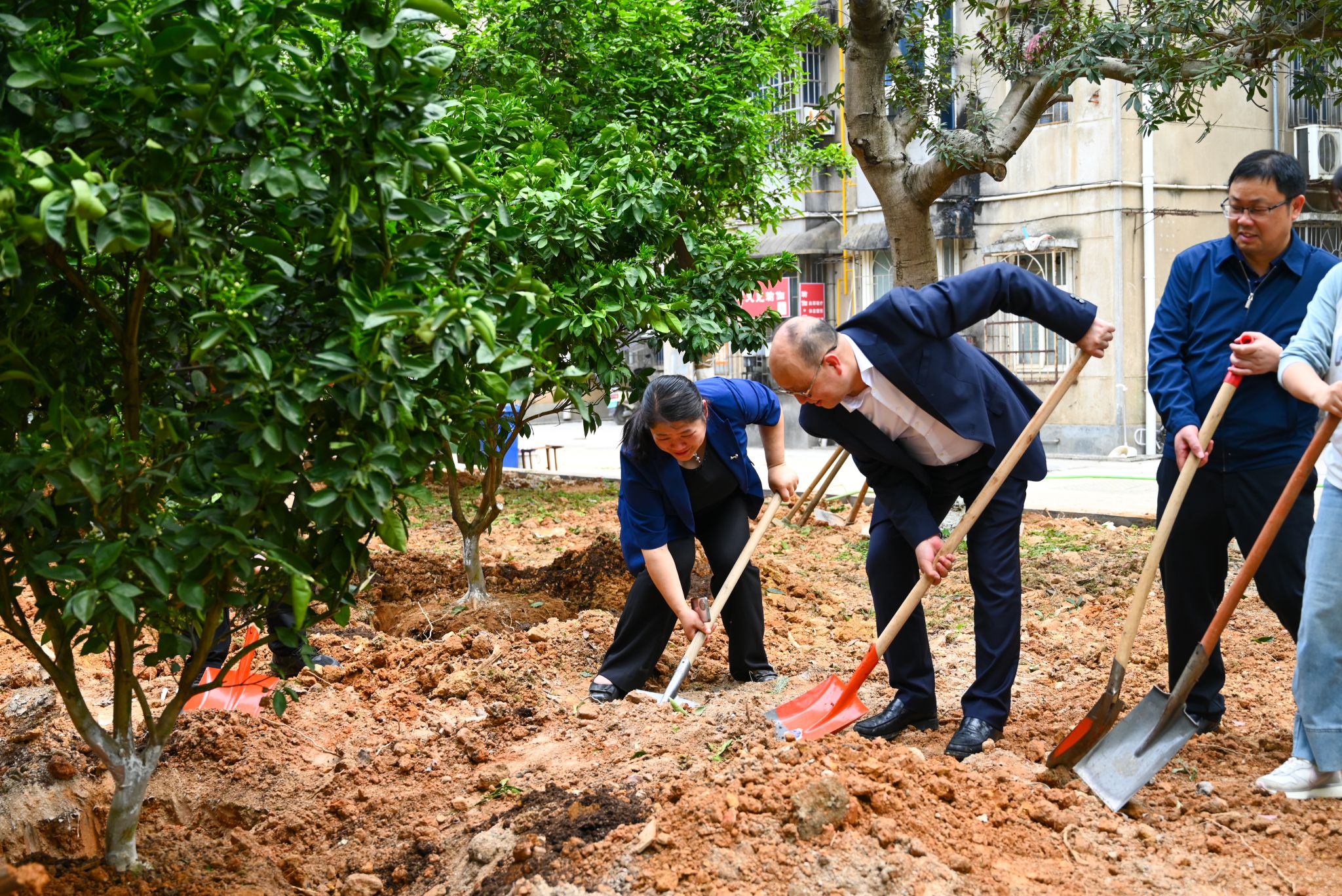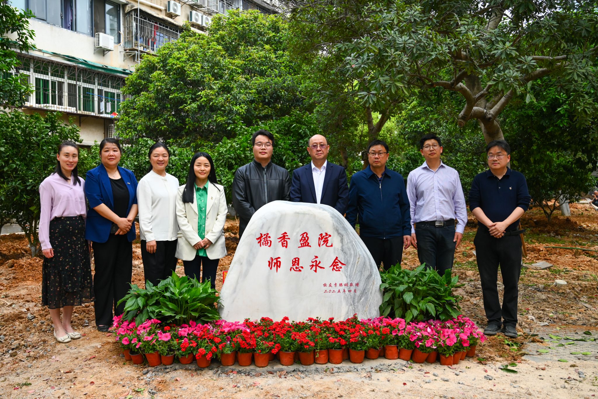 赵鹤平向李腾彪颁发捐赠证书并共同为纪念石揭幕。现场师生一同挥锹铲土、浇水施肥,为学校播撒一片盎然生机。