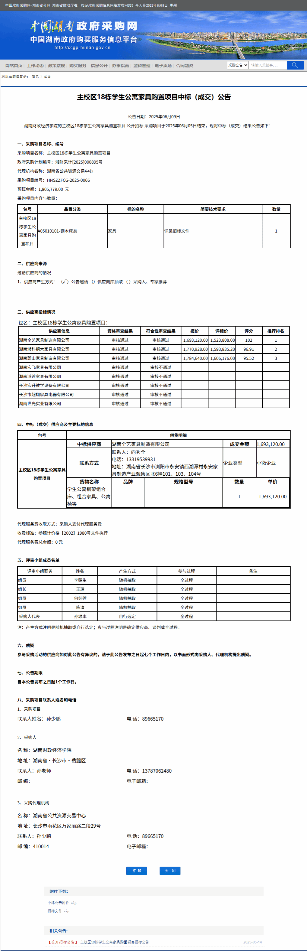 湖南省政府采购网:主校区18栋学生公寓家具购置项目中标(成交)公告