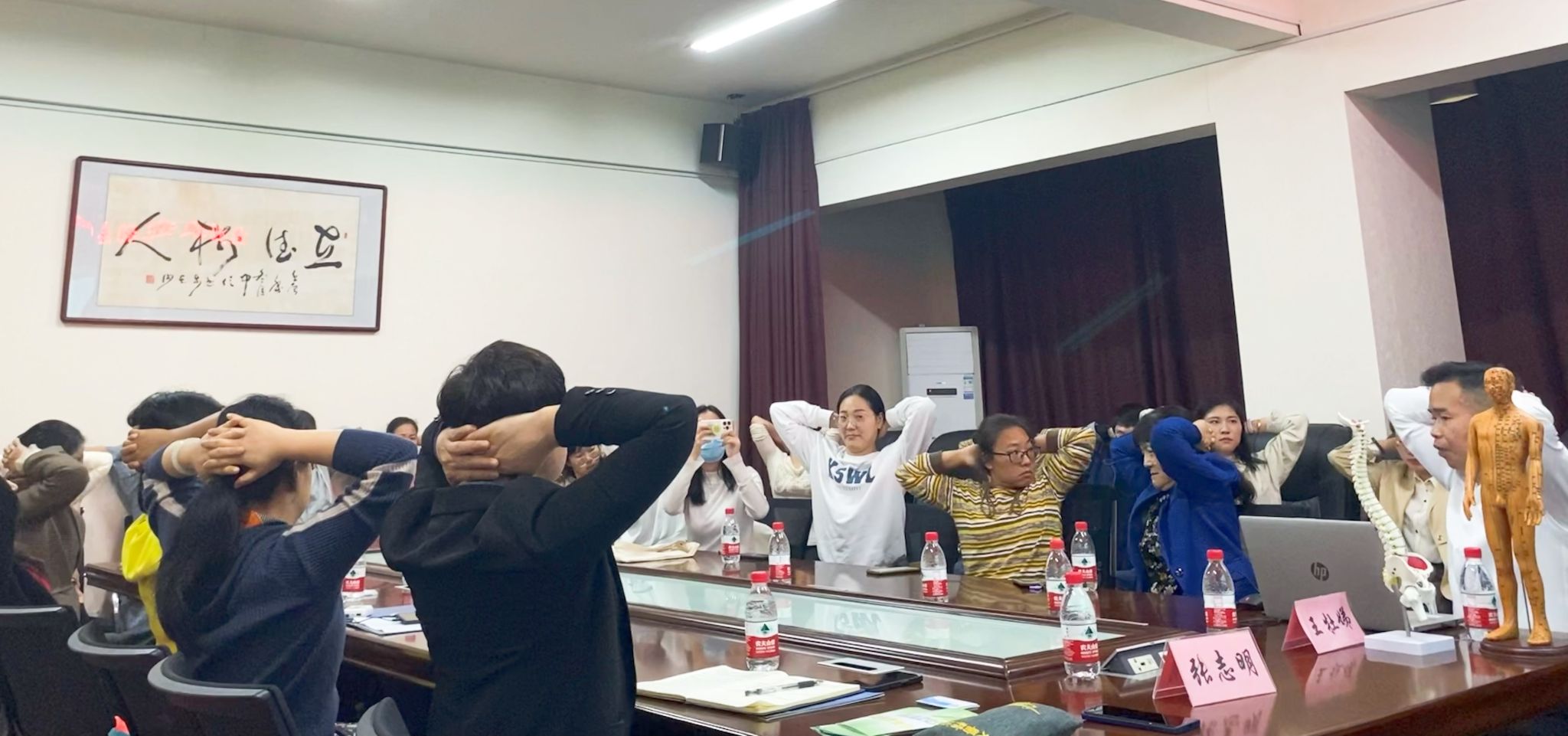 张志明结合日常生活中的真实案例,运用丰富的工作经验和医学知识,生动地讲解了有关颈椎和腰椎的保健知识,与老师们的谈笑间诠释着生命与健康的奥秘。为使老师们能尽可能地避免颈腰病的困扰,张志明现场教大家一套简易的肩颈腰椎保健操和穴位按摩法,老师们边学边做,亲身感受保健操和穴位按摩带来的功效。