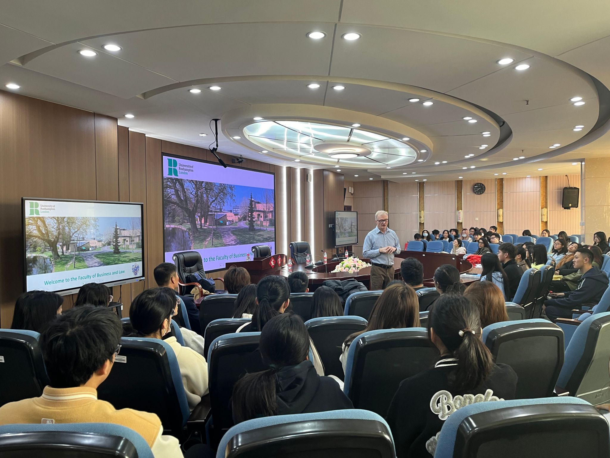 会后,Stephen O’Regan作专题讲座,向永利百余名师生详细介绍了英国罗汉普顿大学的教学设施、学科优势、学业情况、校园环境等,并就学生们提出的关于罗汉普顿大学学位授予、学费和消费水平、交通情况等问题进行了解答。