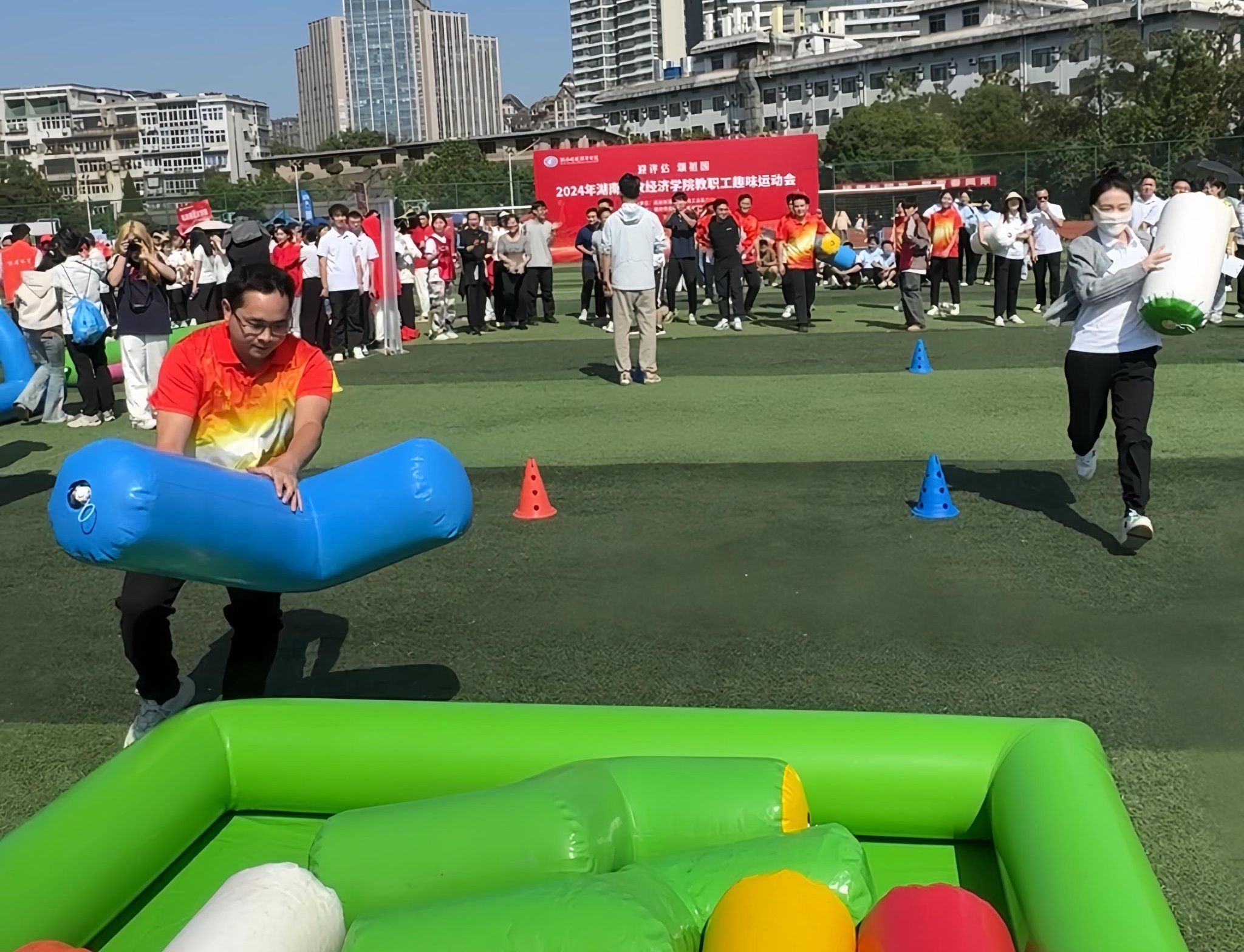 本次趣味运动会以团体项目为主,公司常务副总经理雷绪斌率全体职工参赛,与全校17支队伍同台竞技。本着“友谊第一,比赛第二”的精神,公司职工踊跃参加“龙行天下”“凝心聚力”“砥砺前行”和“灌篮高手”四项趣味竞技项目,每个项目都趣味十足,充满智慧的较量和飞扬的激情。