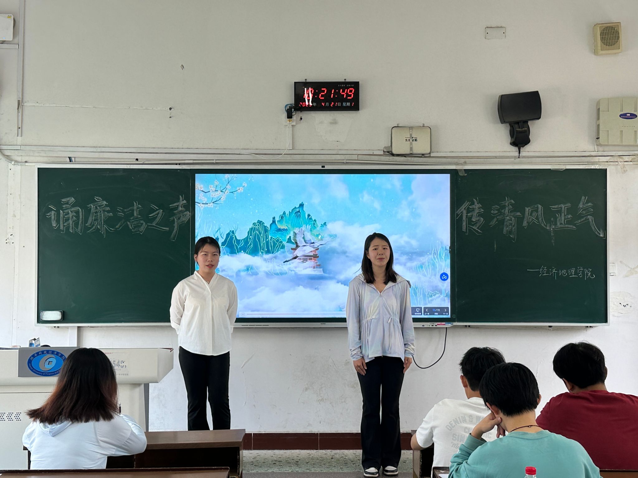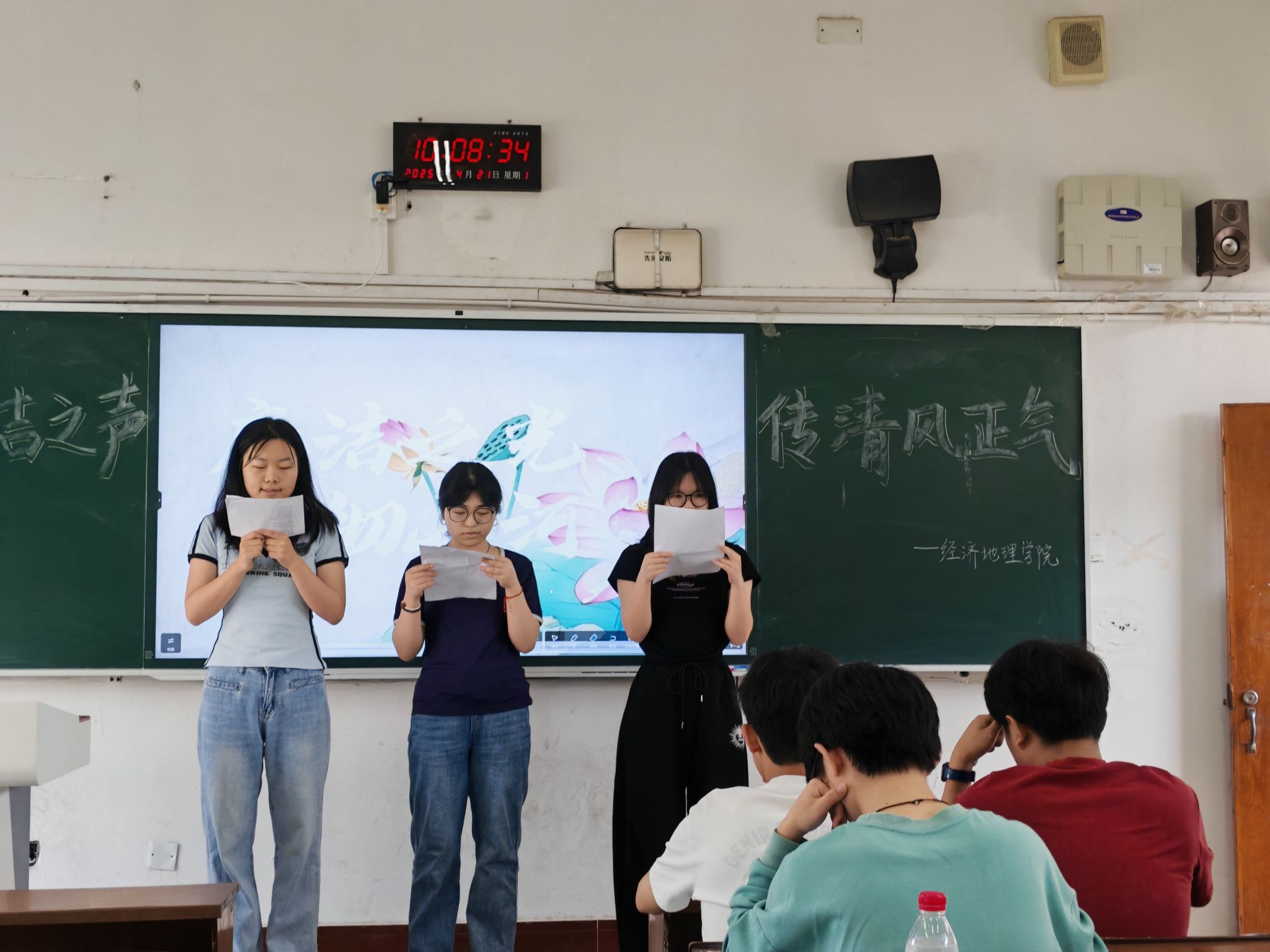 (本网讯)为进一步贯彻落实中央八项规定精神,把加强作风建设与弘扬廉洁文化贯通起来,充分发挥廉洁文化培根铸魂作用,扎实开展廉洁文化月活动,4月21日,经济地理学院在主校区2101教室举办了“诵廉洁之声,传清风正气”学生廉洁主题朗诵比赛,院党支部书记姚旭辉、副院长苏昌贵出席活动。
