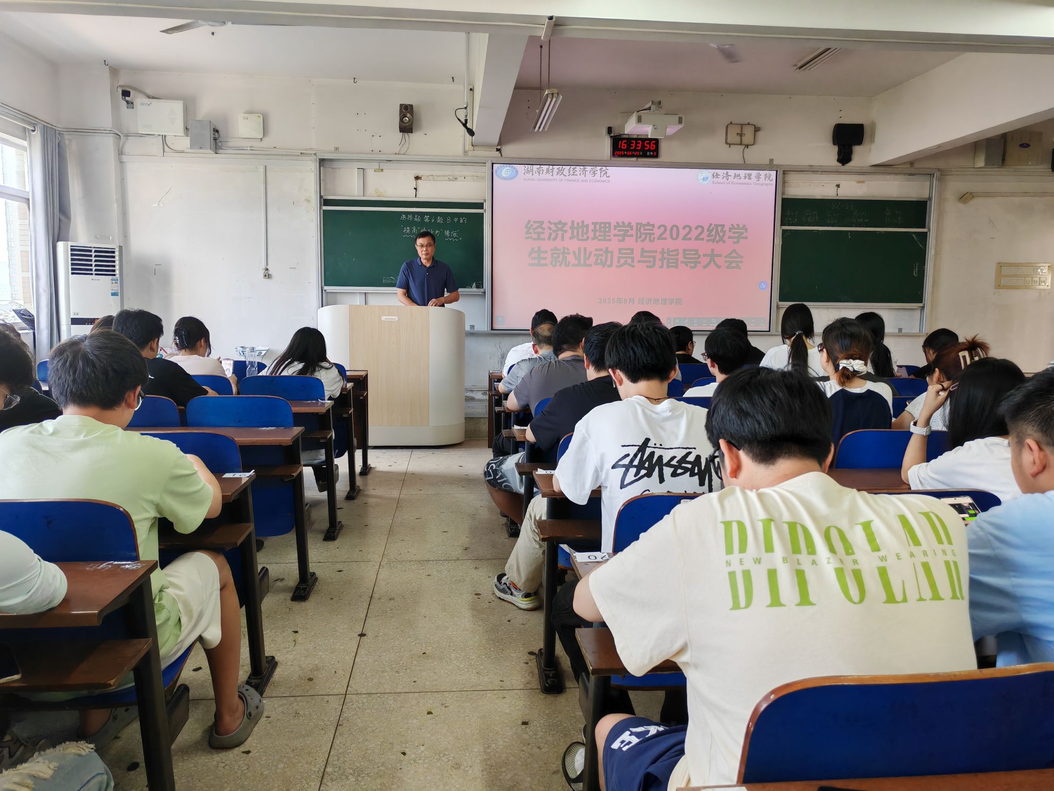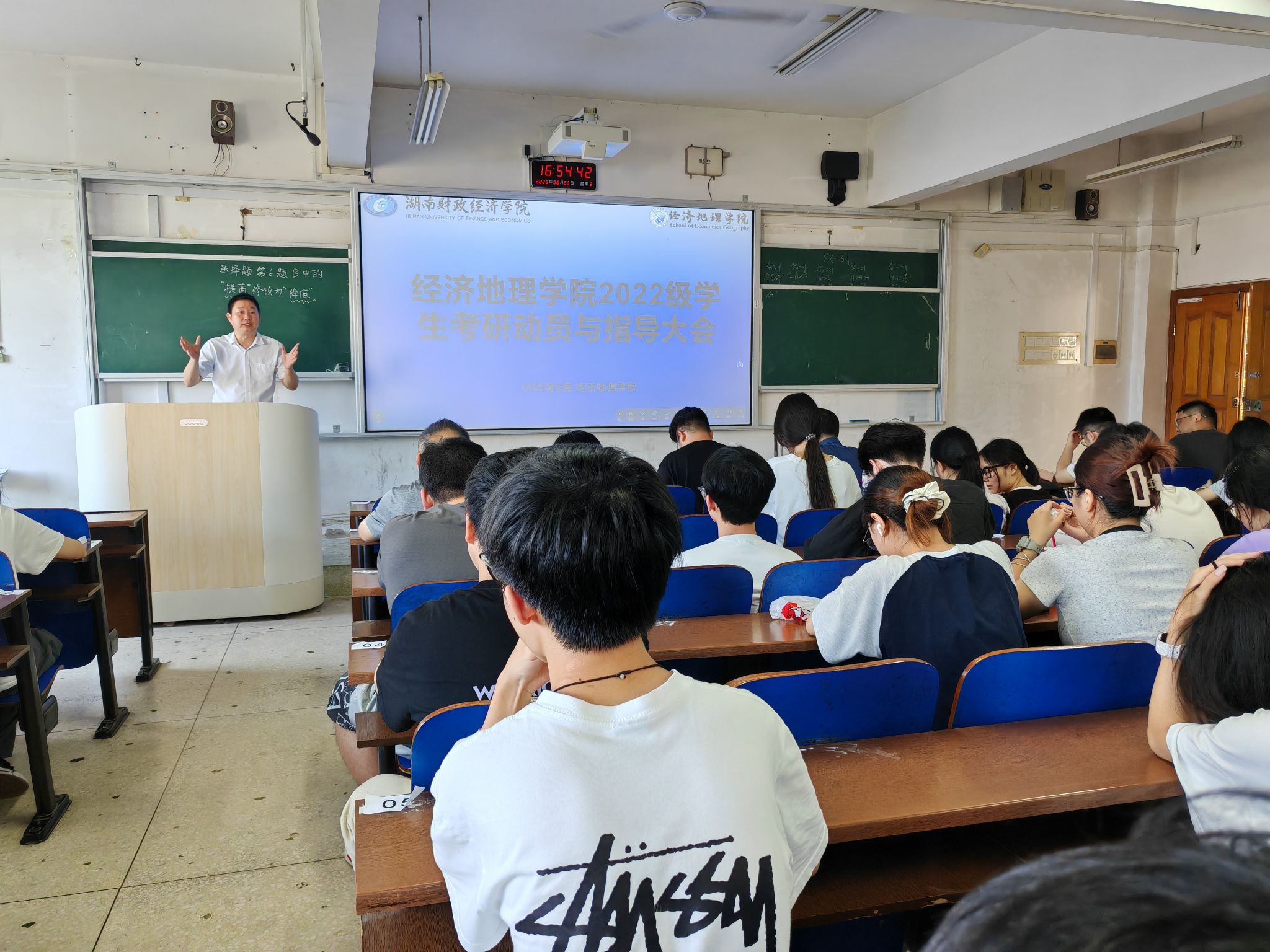 (本网讯)为助力2022级人文地理与城乡规划专业学生精准锚定就业方向,科学规划考研与考公路径,6月25日,经济地理学院在主校区3208教室隆重召开2022级就业动员与考研指导大会。院长彭文斌、院直属党支部书记书记姚旭辉、副院长苏昌贵、学工办主任刘娟、团总支书记刘权以及人文地理与城乡规划系全体教师齐聚一堂,为学生们带来极具针对性的指导与建议。