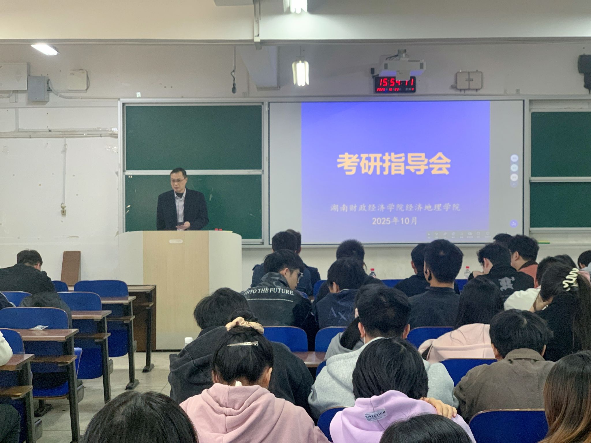 (本网讯)金秋时节,桂香满院。为帮助2026届学子明确考研方向、掌握备考方法,10月23日下午两点,经济地理学院于主校区三教学楼3209教室举办2026届考研指导会。本次活动紧扣地理学科特色,将专业思维与考研规划深度融合,特邀湖南工商大学研究生院副院长吴伟平教授进行考研经验指导,为即将踏上考研征程的地理学子搭建了精准高效的交流平台。院长彭文斌、院直属党支部书记姚旭辉、副院长苏昌贵、学科办主任欧阳宁相、学工办主任刘娟和毕业班辅导员刘权以及2022级考研学子参加。