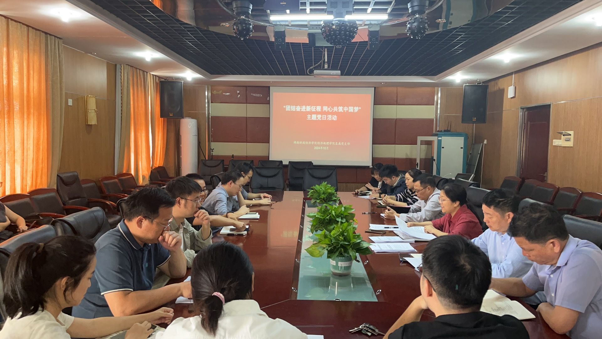 (本网讯)10月11日下午,经济地理学院直属党支部在主校区行政楼1014会议室开展“团结奋进新征程 同心共筑中国梦”主题党日活动。本次活动由院直属党支部书记姚旭辉主持,学院全体党员参加。