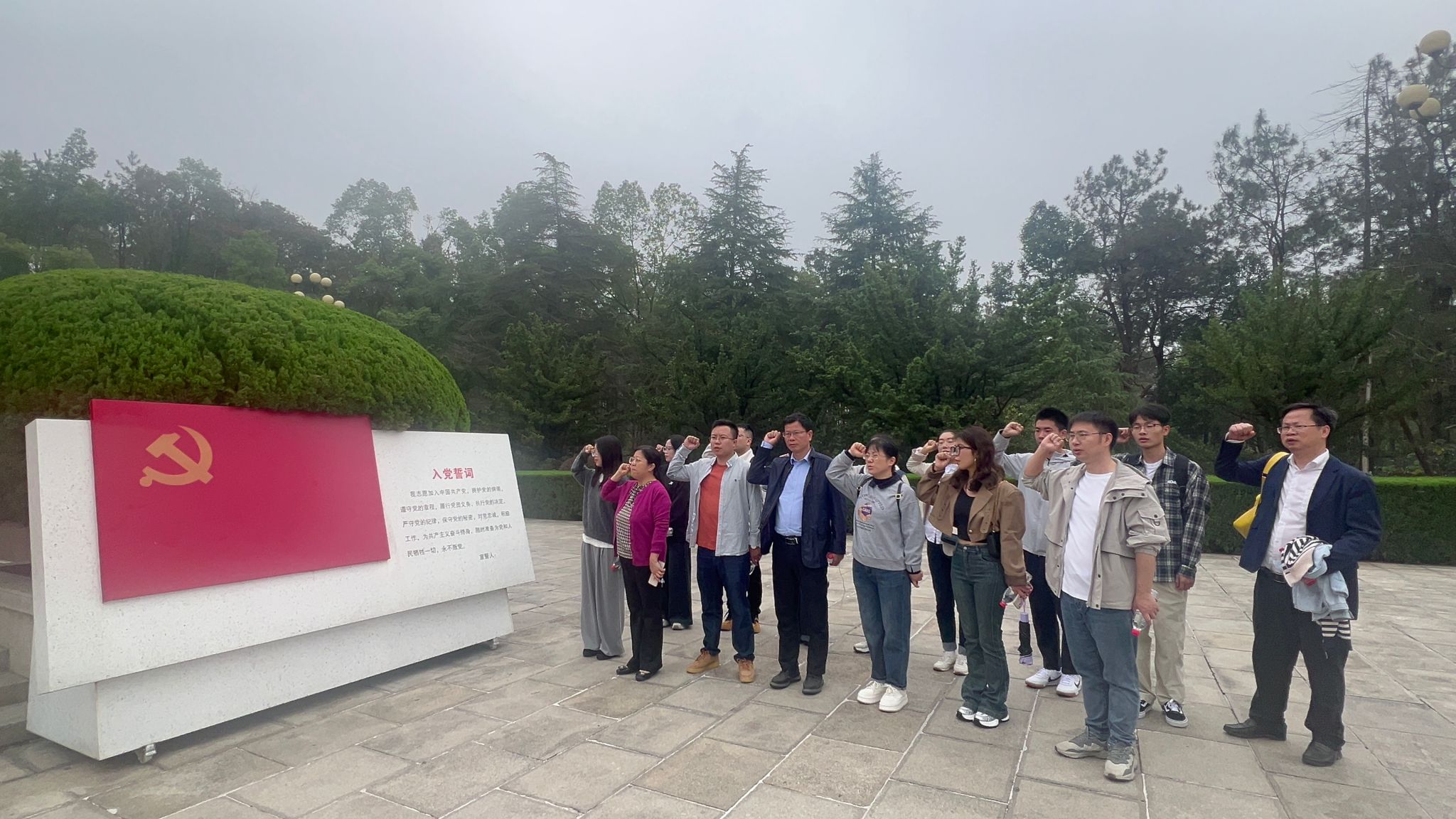 第一站到达刘少奇铜像广场。全体党员庄严肃立,怀揣着无比崇敬的心情瞻仰伟人铜像,表达对伟大领袖的崇高敬意与深切缅怀,并在院直属党支部书记姚旭辉的带领下,全体党员面对庄严的党旗,重温入党誓词。