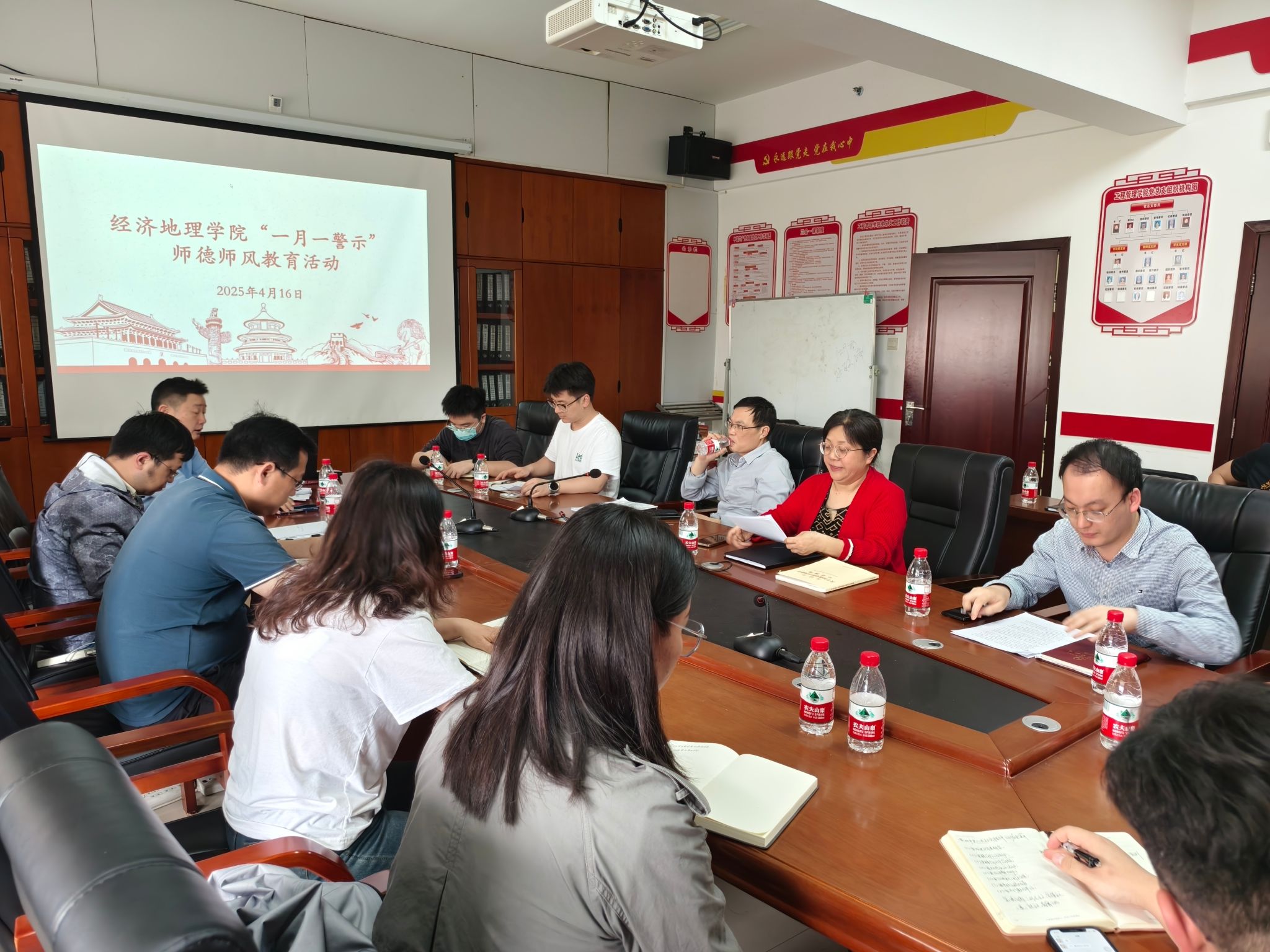 (本网讯)为强化教职工廉洁自律意识,营造风清气正的育人环境,4月16日下午,经济地理学院在主校区办公楼911会议室开展“一月一警示”师德师风教育活动,会议由院直属党支部书记姚旭辉主持,学院党政领导班子成员出席会议、全体教师参加会议。