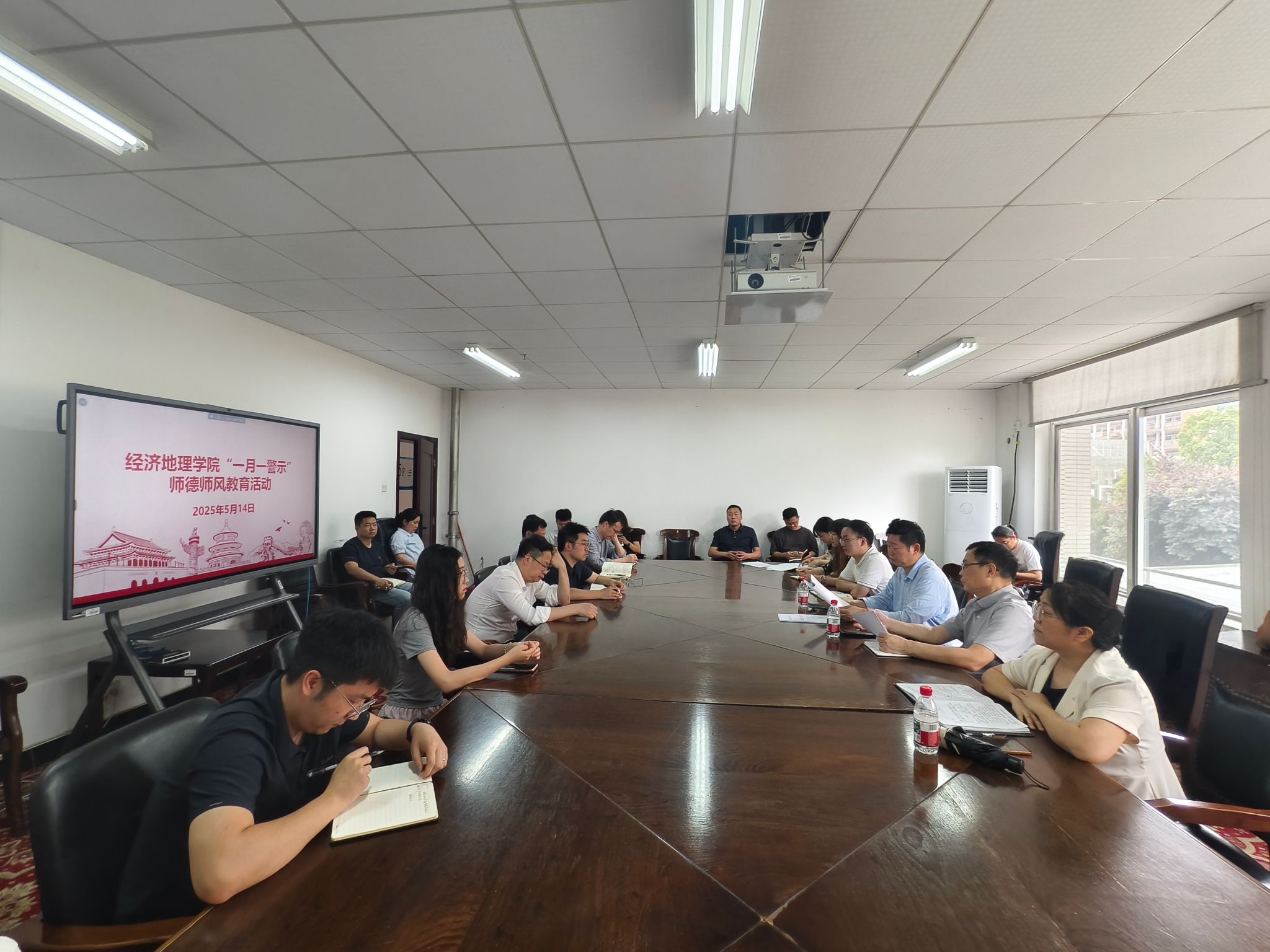 (本网讯)为进一步筑牢教职工廉洁从教思想防线,厚植崇廉尚洁的教育生态,5月14日下午,经济地理学院在主校区办公楼515会议室开展“一月一警示”师德师风教育活动,会议由院直属党支部书记姚旭辉主持,学院党政领导班子成员及全体教师参会。