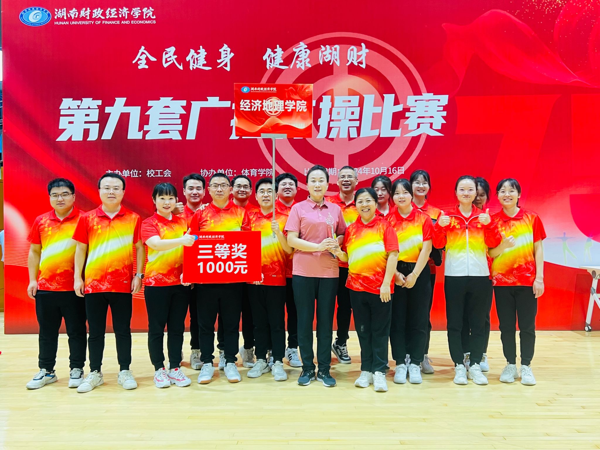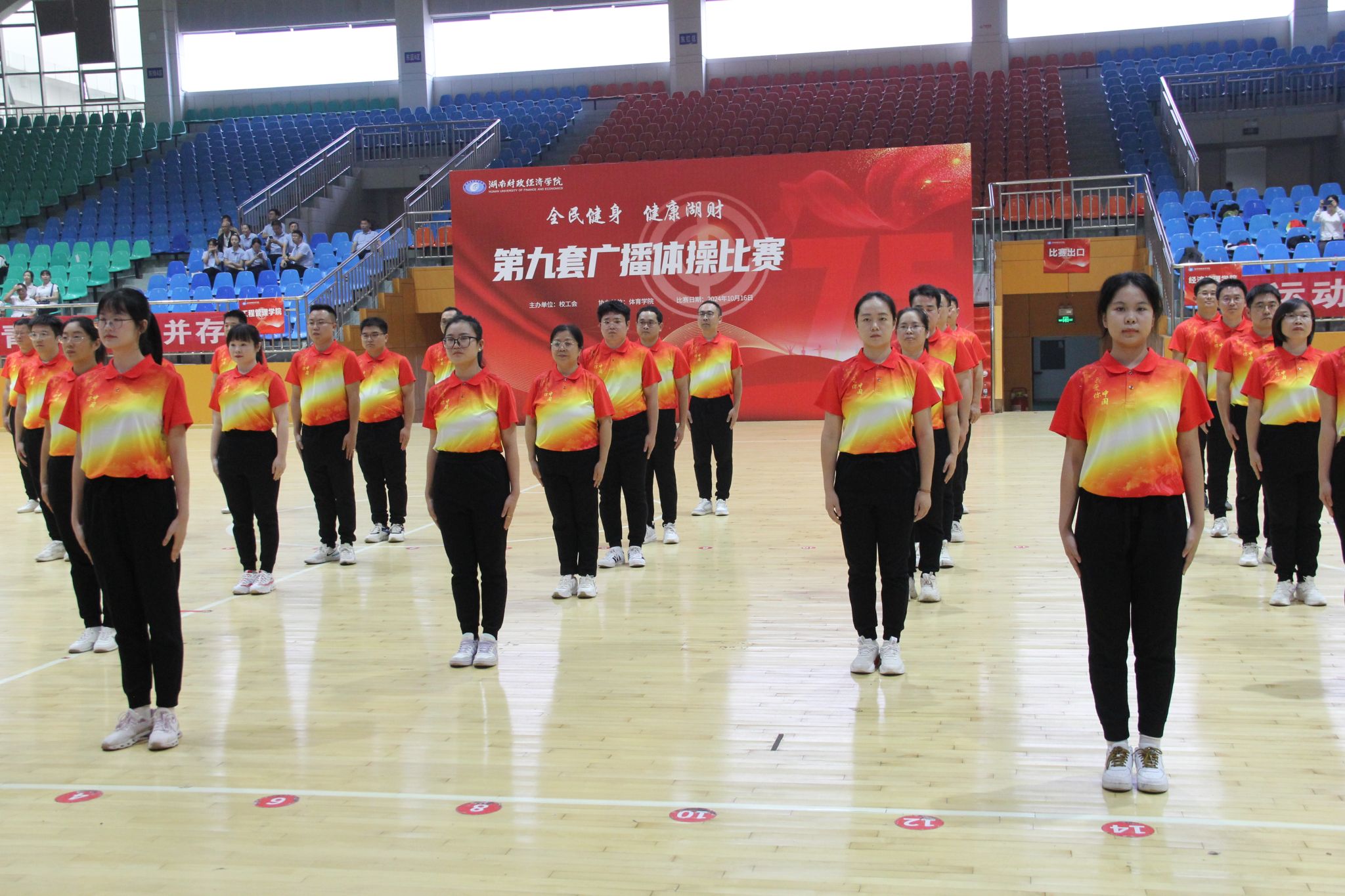(本网讯)为大力推进教职工健身运动,丰富广大教师的业余生活,10月16日下午,由校工会主办,体育学院协办的“全民健身 健康湖财”2024年学校教职工第九套广播体操比赛于10月16日下午在主校区体育馆拉开了帷幕。全校共有18个分工会代表队参加比赛。