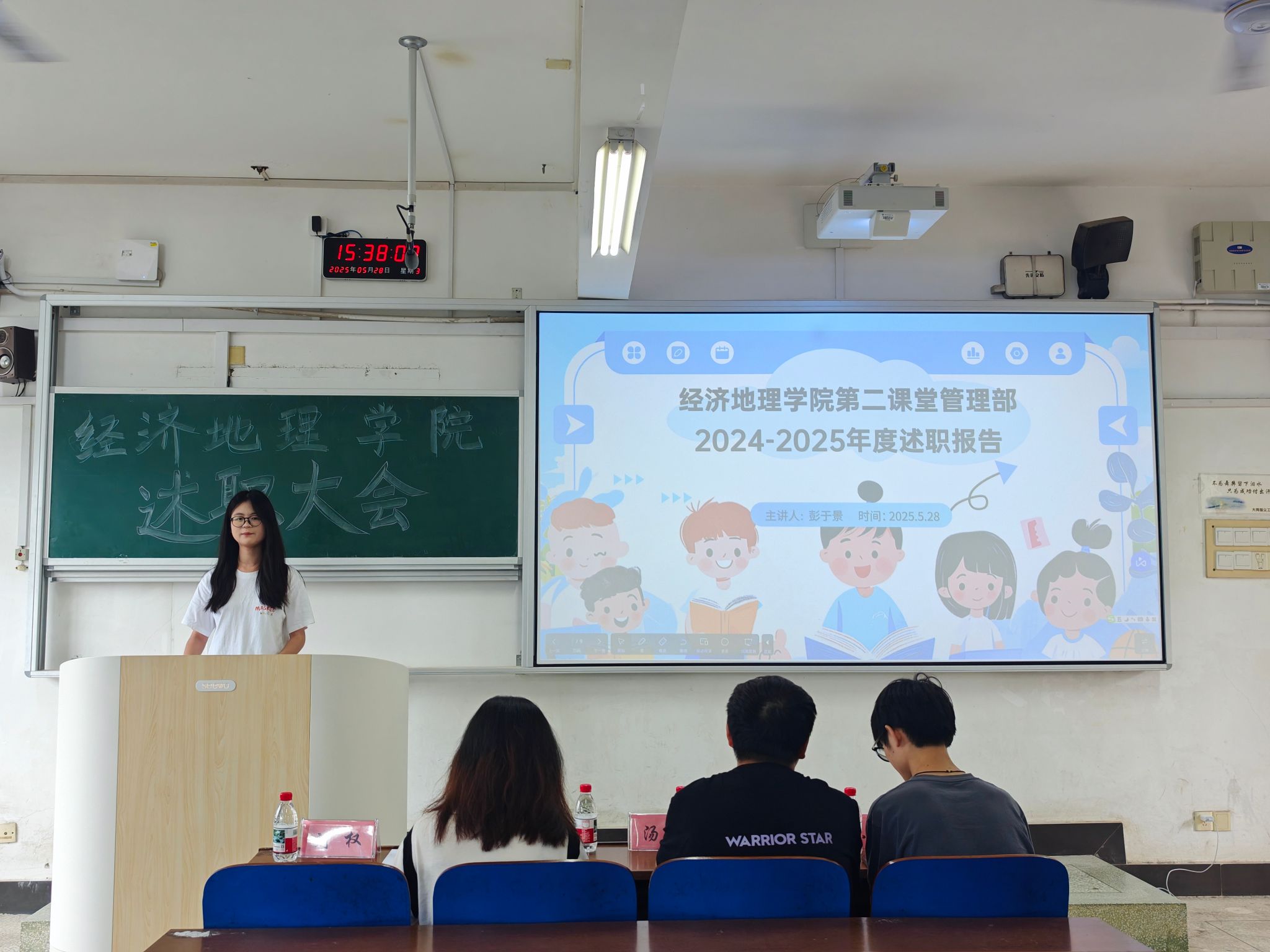 (本网讯)为全面总结学院2024-2025年度团学工作成果,提升团队协作能力,促进团学会各部门工作交流。5月28日,经济地理学院在主校区第三教学楼3404教室召开年度述职大会。院团总支书记刘权、团学会主席团成员及团学会各部门成员参会。
