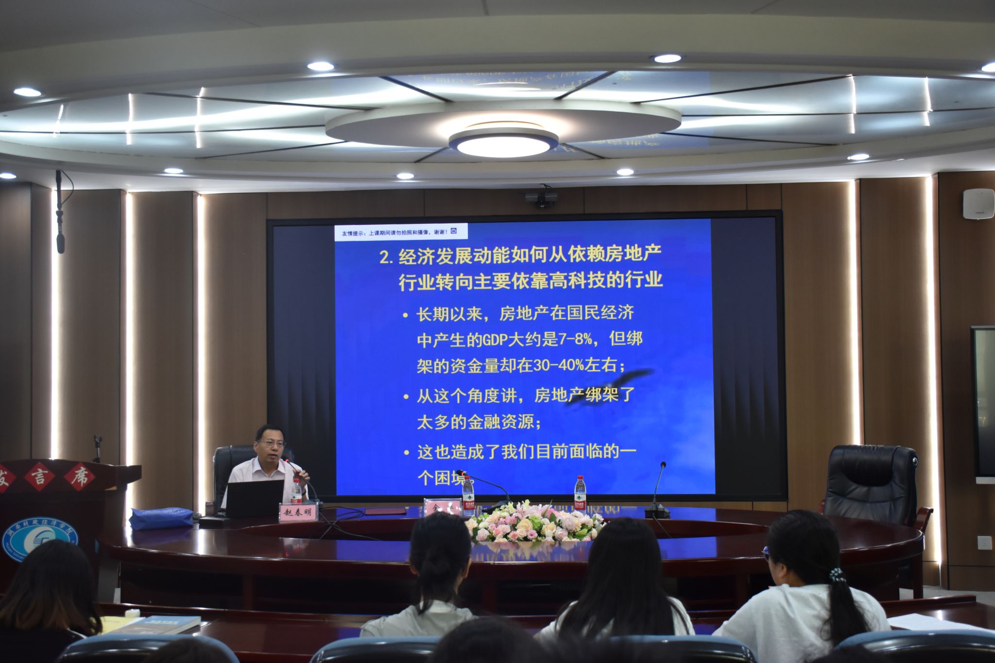 (本网讯)5月26日上午,教育部经济与贸易类专业教学指导委员会副主任委员、教育部全国国际商务专业学位研究生教育指导委员会委员、北京师范大学经济与工商管理学院博士生导师赵春明教授应经济学院邀请作“中国经济高质量发展的机遇与挑战”主题讲座。讲座由经济学院党委书记余华主持,经济学院副书记刘英及师生代表100余人聆听了讲座。