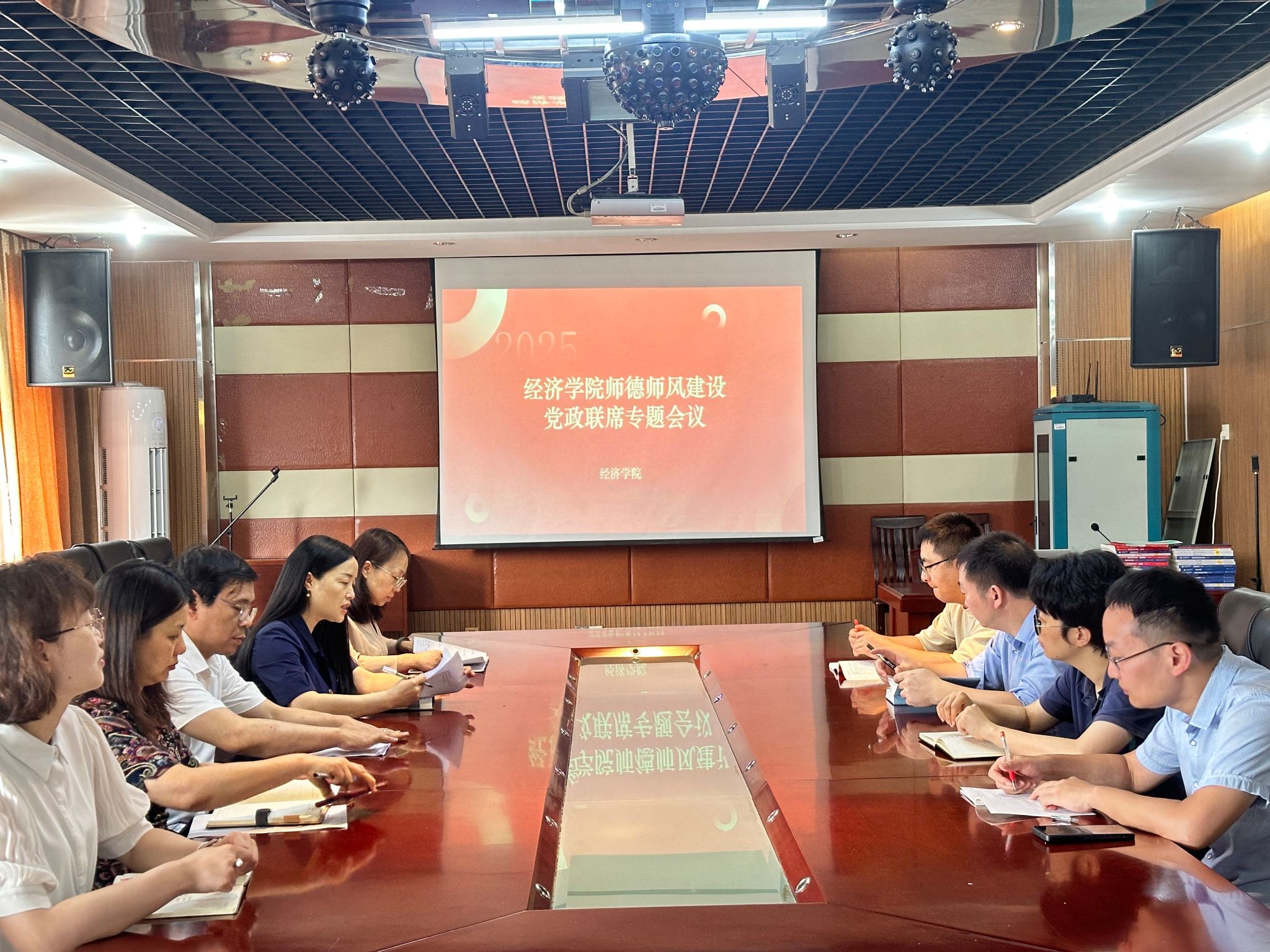 (本网讯)4月16日上午,经济学院党政领导班子召开师德师风建设专题会议,研究部署学院师德师风建设工作。会议由经济学院党委书记余华主持,全体党政领导班子成员、各系部主任参加。