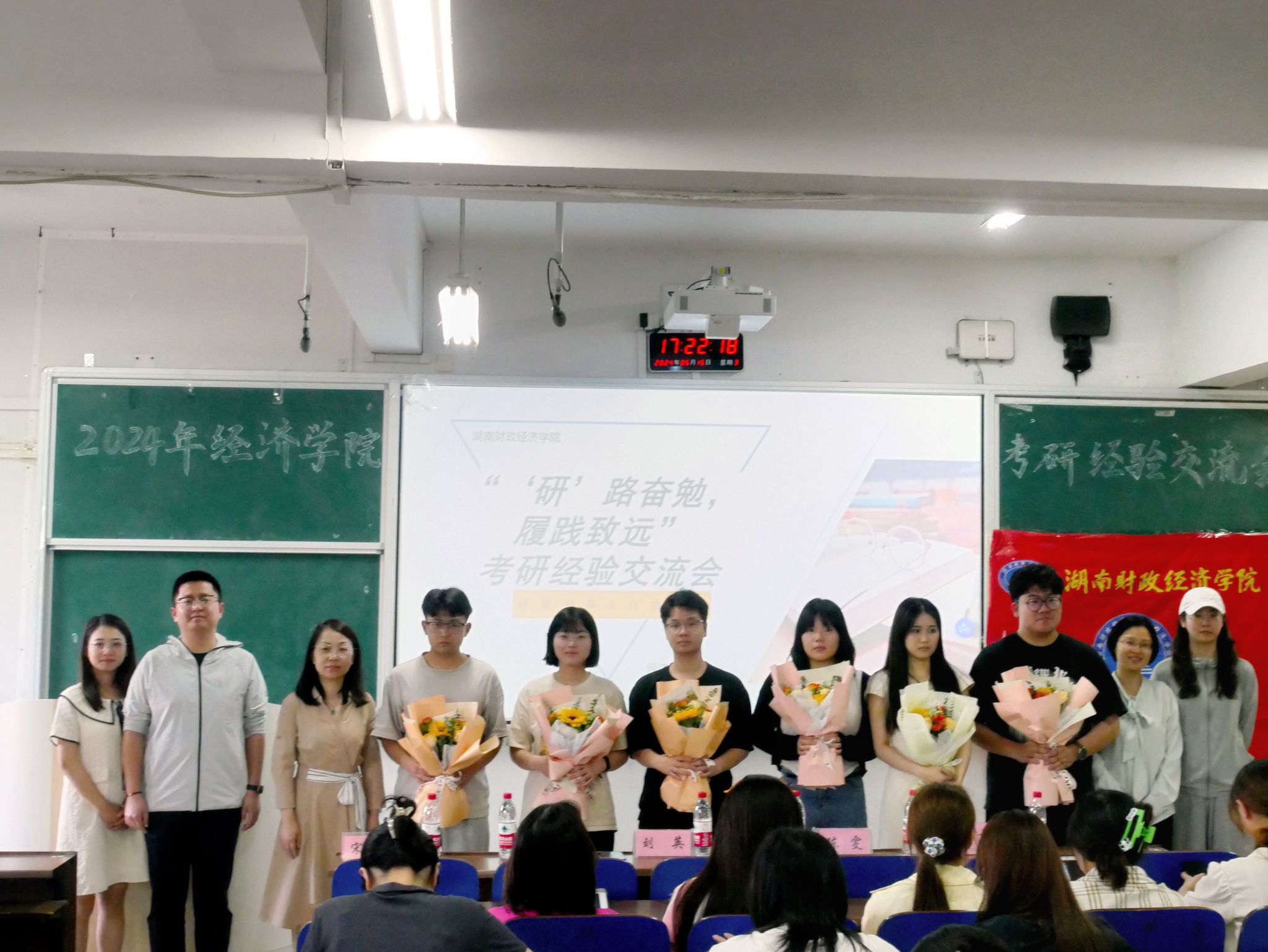 (本网讯)为激发学生的考研热情,增强学生考研的信心和决心,创造良好的学习氛围,推动我院的学风建设。经济学院于5月15日15:00在三教3110教室成功举办了“‘研’路奋勉,履践致远”考研经验分享会。本次经验分享会特邀我院2020级优秀的考研学生代表分享考研经验,经济学院党委副书记刘英、副院长陈雯、学工负责人谢龙、全体辅导员以及21、22级有考研意向的同学出席本次会议。
