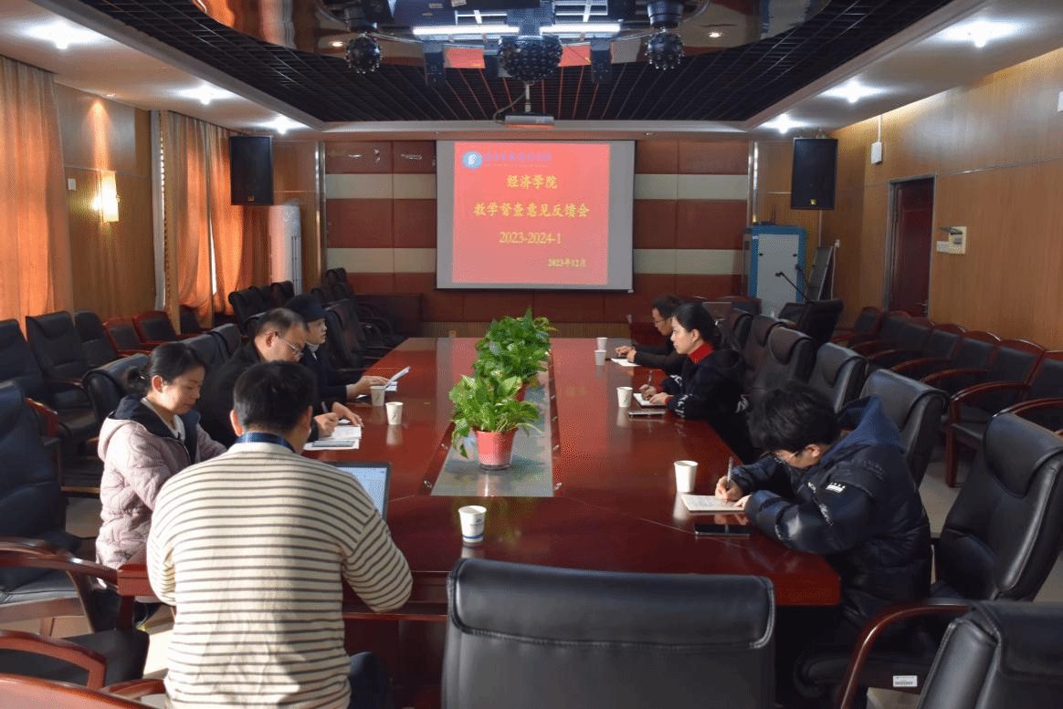 (本网讯)为提高任课老师授课能力,根据《关于学校第四届教学督导组本学期教学督查情况反馈安排的通知》文件精神。12月28日上午,经济学院开展教学督查情况反馈会议,学校教学督导曾丽君老师、质评处王依主任应邀出席本次会议,经济学院副院长陈雯、国商系主任张扬、经济系主任杨芸、教务办主任王玉喜、教务办高小平老师到场聆听。