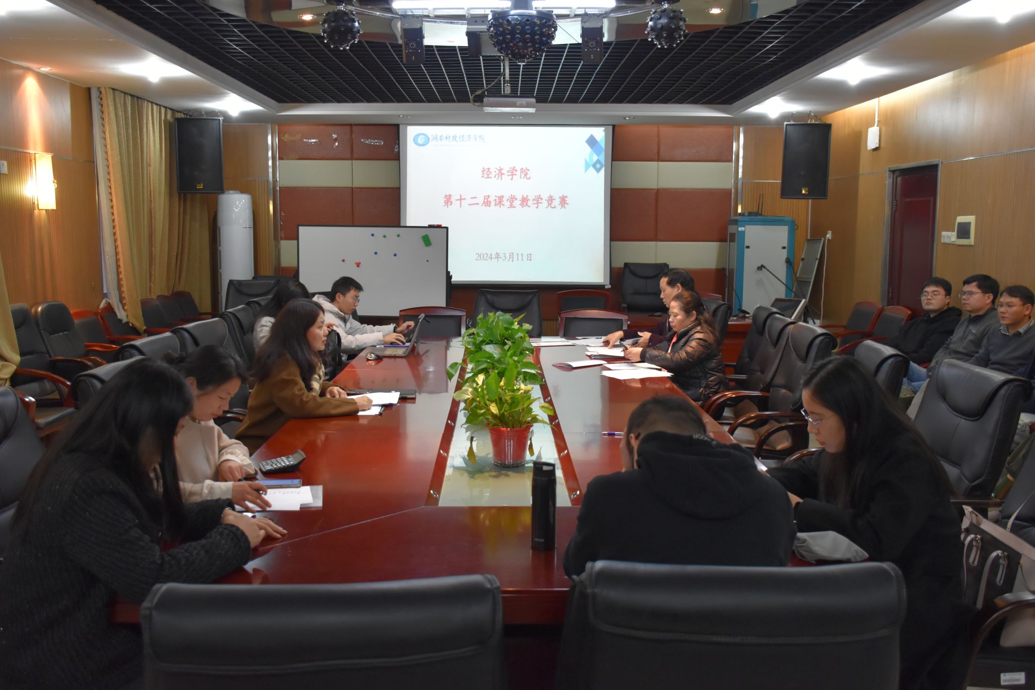 (本网讯)为了进一步深化学院本科教育教学改革,切实提升课堂教学效果,3月11号晚,经济学院在1014会议室举行了2024年度高校教师课堂教学竞赛。本次竞赛由副院长陈雯主持,共有15位教师参赛,评委组秉着公平公正公开的原则,为选手们现场评分,并组织其他教师现场观摩学习。