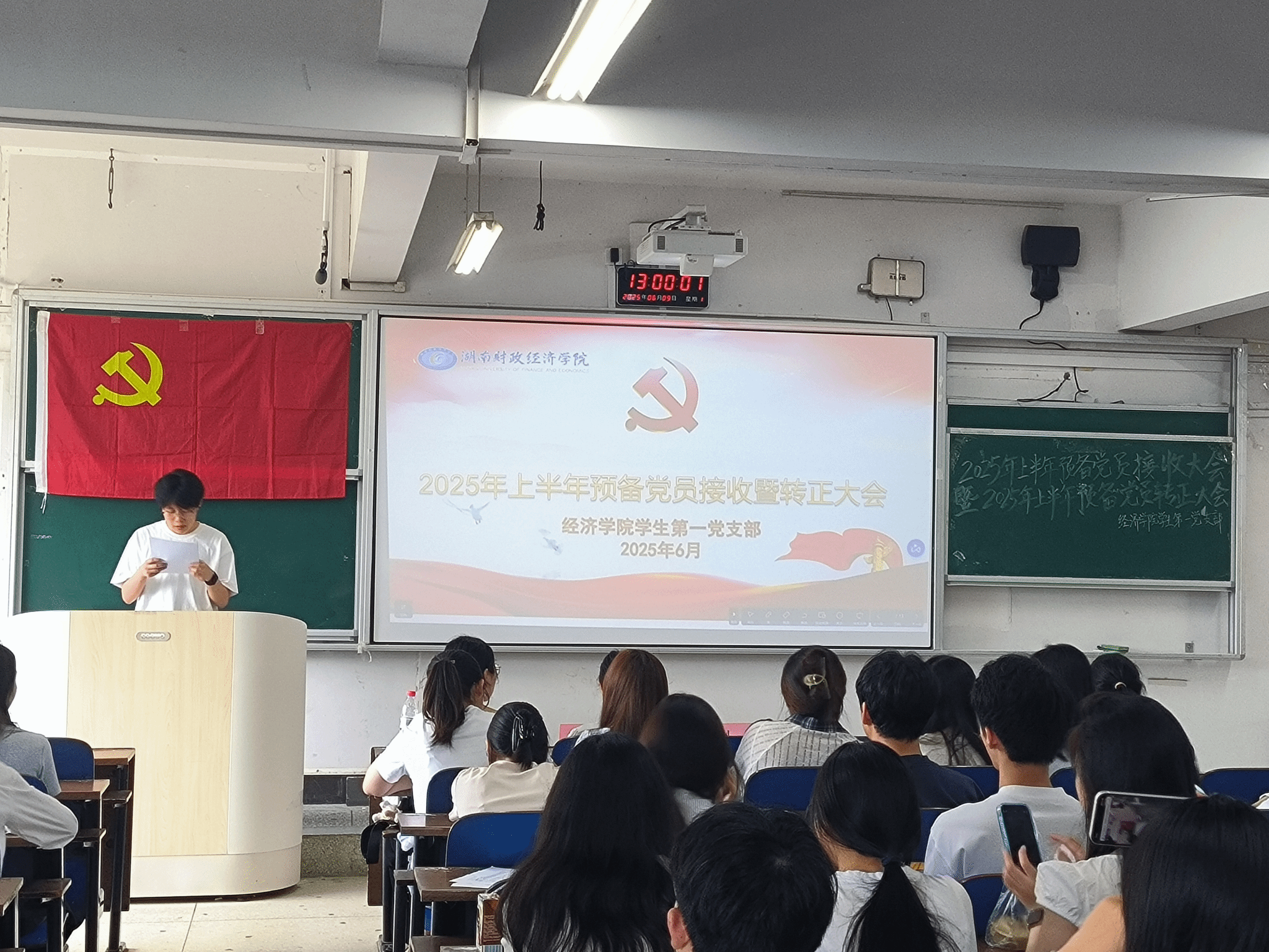 (本网讯)2025年6月9日,经济学院学生第一党支部于3108教室召开2025年上半年预备党员接收大会暨预备党员转正大会。经济学院党委副书记刘英、学生第一党支部书记余佳、辅导员王竹青、副教授陈素琼出席本次会议,支部全体党员及11位发展对象参会。