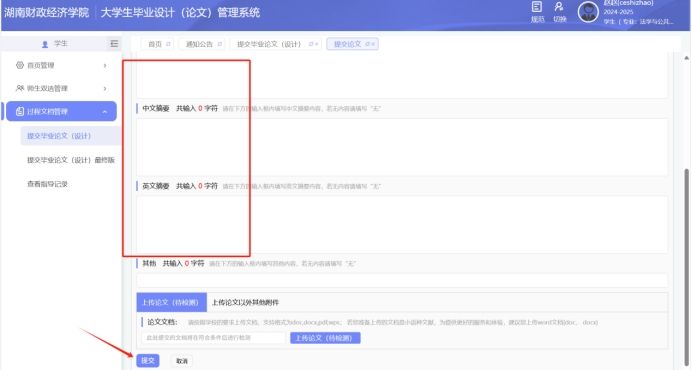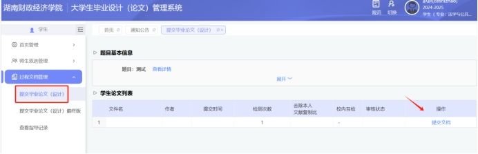 (一)点击“过程文档管理”---“提交毕业设计(论文)”,进入论文提交页面。